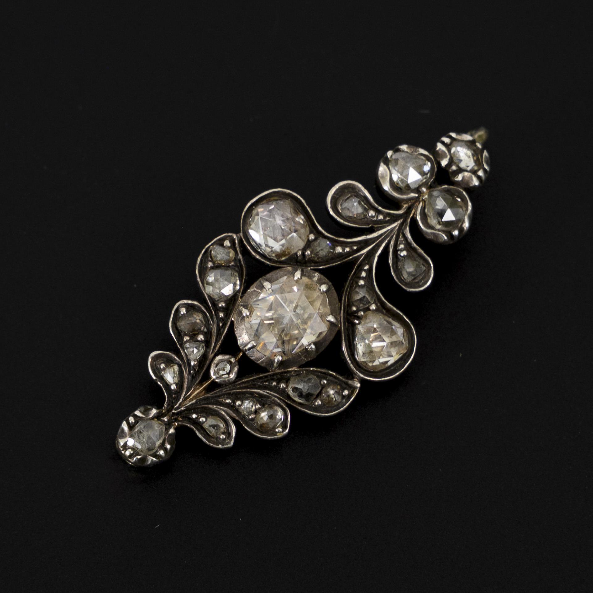 Historical pendant ca. 2nd half 19th century, probably originally a pendant for a jour-et-nuit earring, set with rose-cut diamonds in silver foil on the back. Hinged eyelet, not completely closed, gold plating on the back partially worn off.