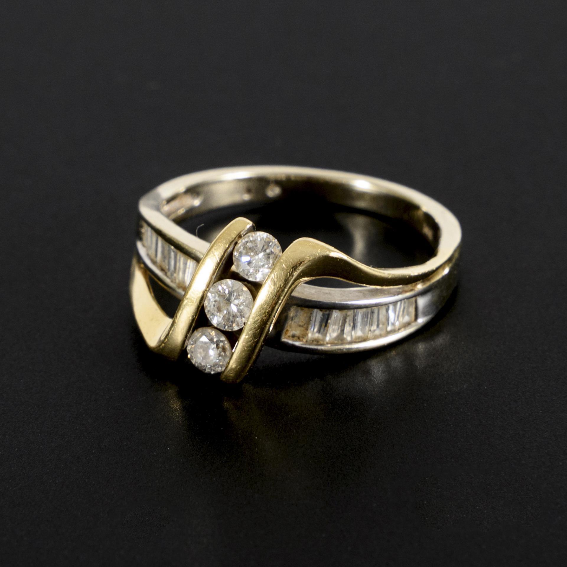 Bicolored ring in a banded design with a ring head in yellow gold with a trilogy of brilliant-cut diamonds on a band with baguette-cut diamonds channel-set in white gold. With signs of wear, especially to the baguette-cut diamonds.