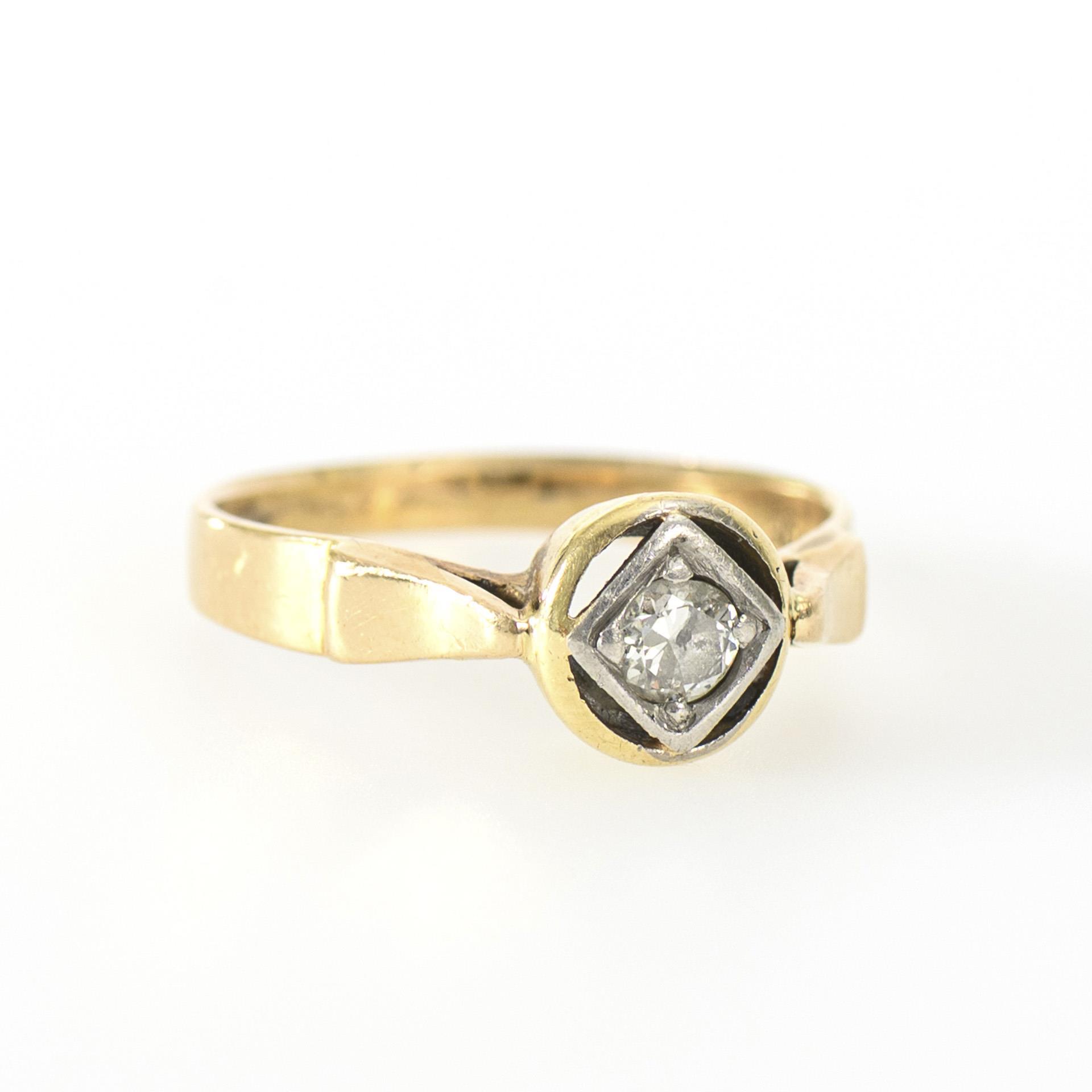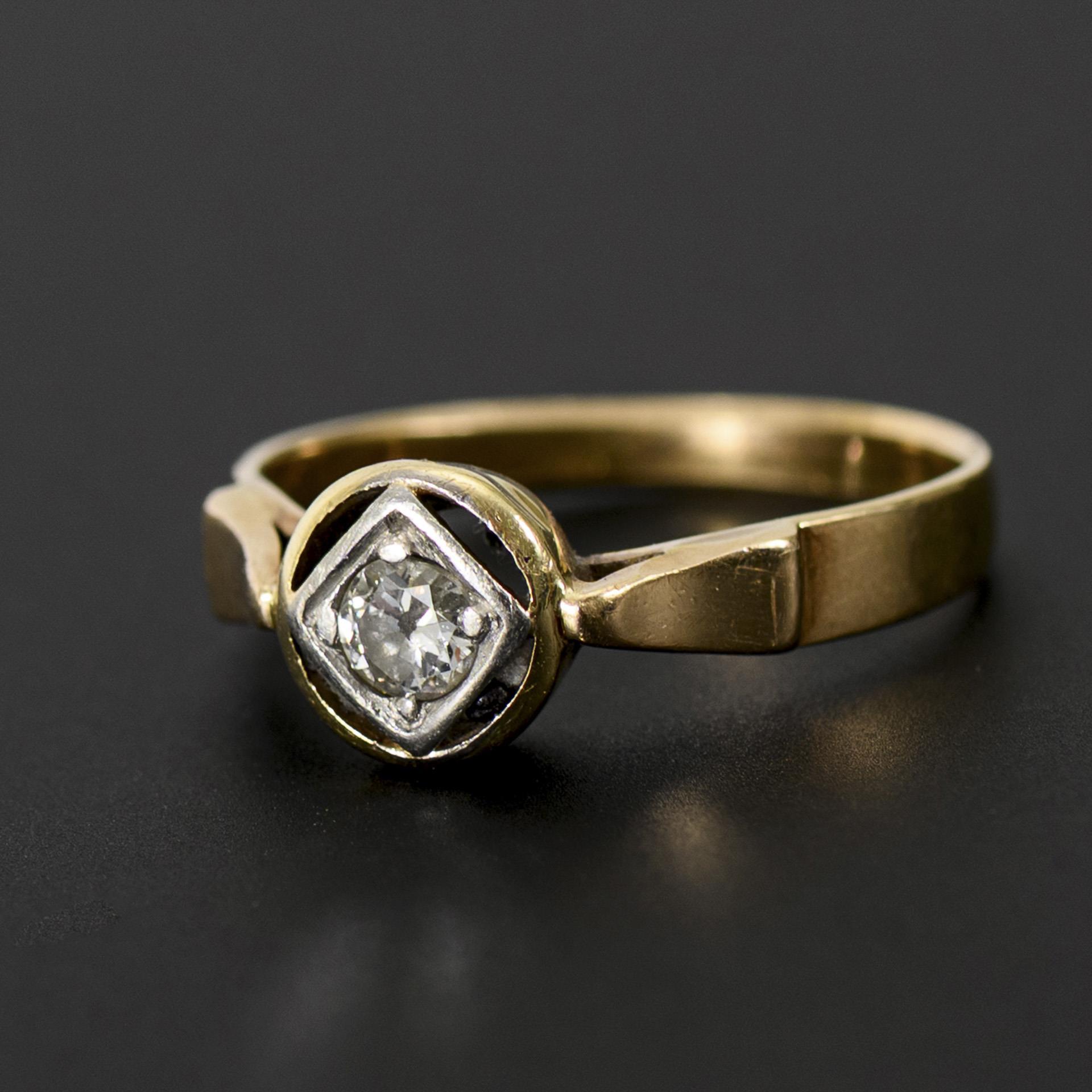 Ring with brilliant-cut diamond set in white gold in a round ring head between a yellow gold shank tapering towards the ring shoulders. Ring shank with slight signs of wear commensurate with age.