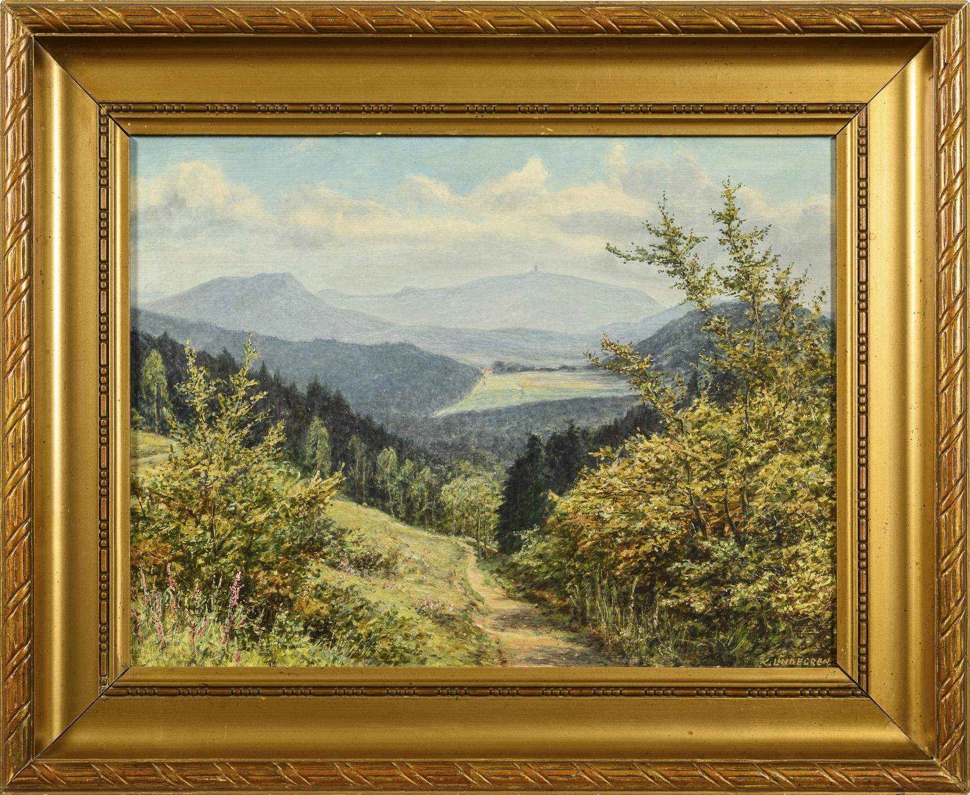 Sunny landscape with a view over the Thuringian Forest to the mountain on the horizon. A small defect.