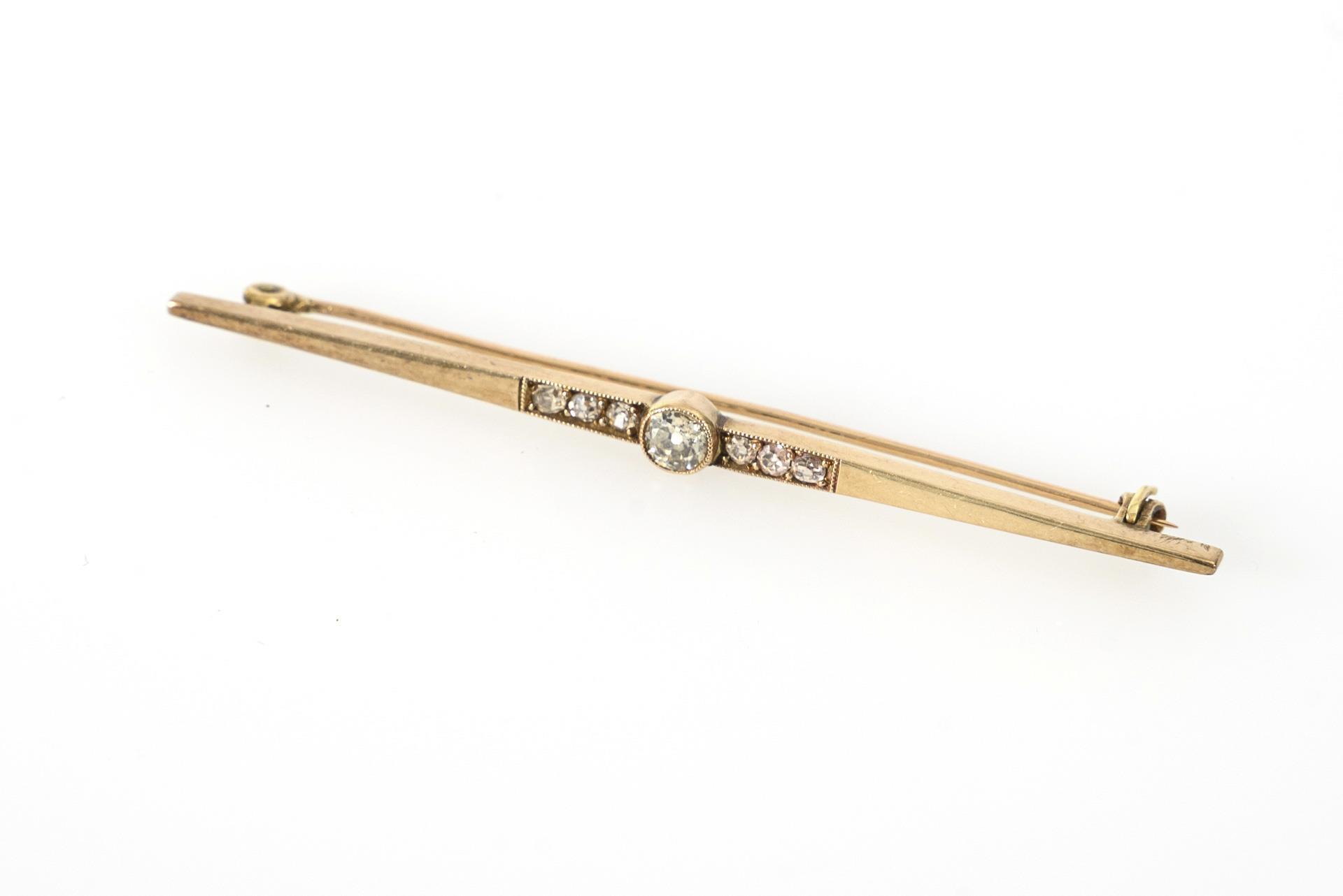 Classical bar brooch with bezel-set old-cut diamond, 3 pavé-set diamonds on each side, the stone settings with millegrain decoration. Signs of wear, mostly on the back.