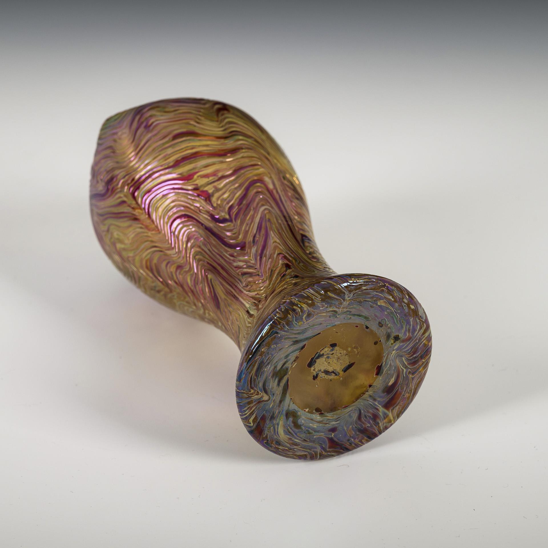 Colourless glass, preblown in a ribbed model, with silver-yellow and red-violet crumbs, iridescent; dislocated rim. H 18.5 cm.