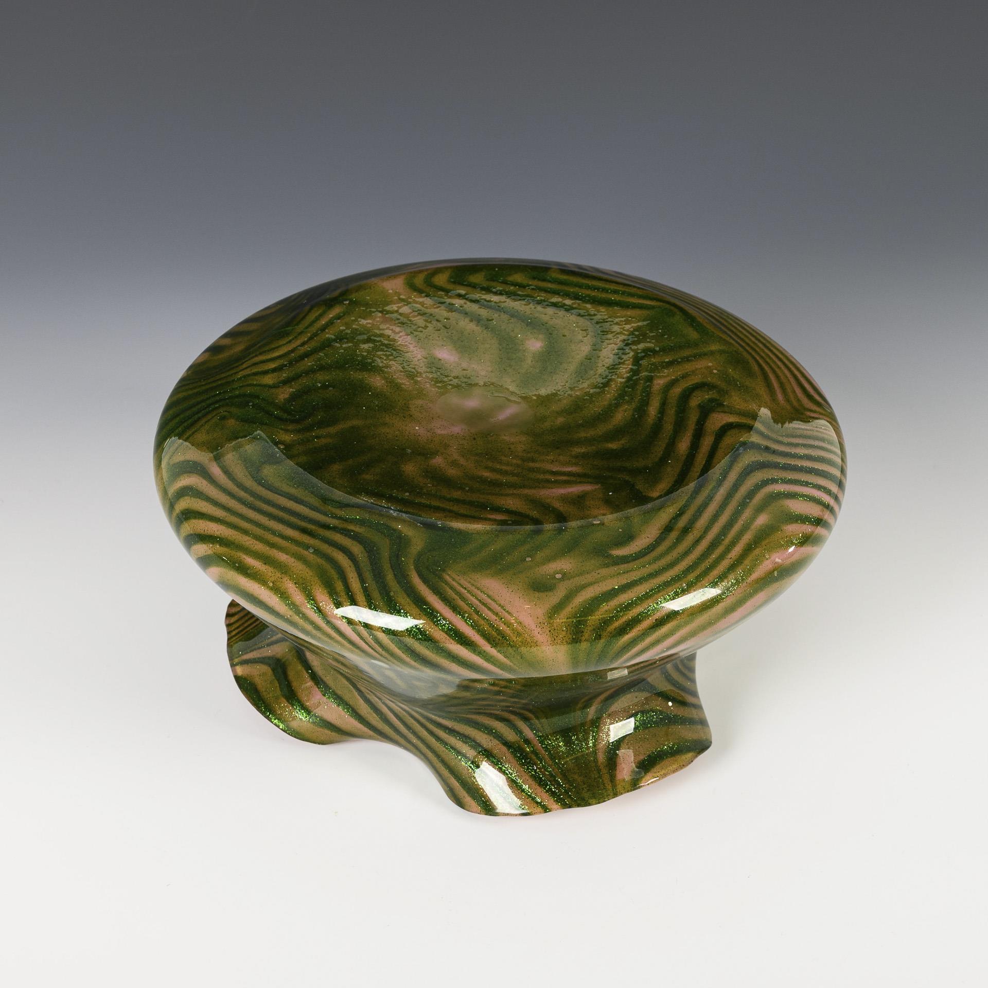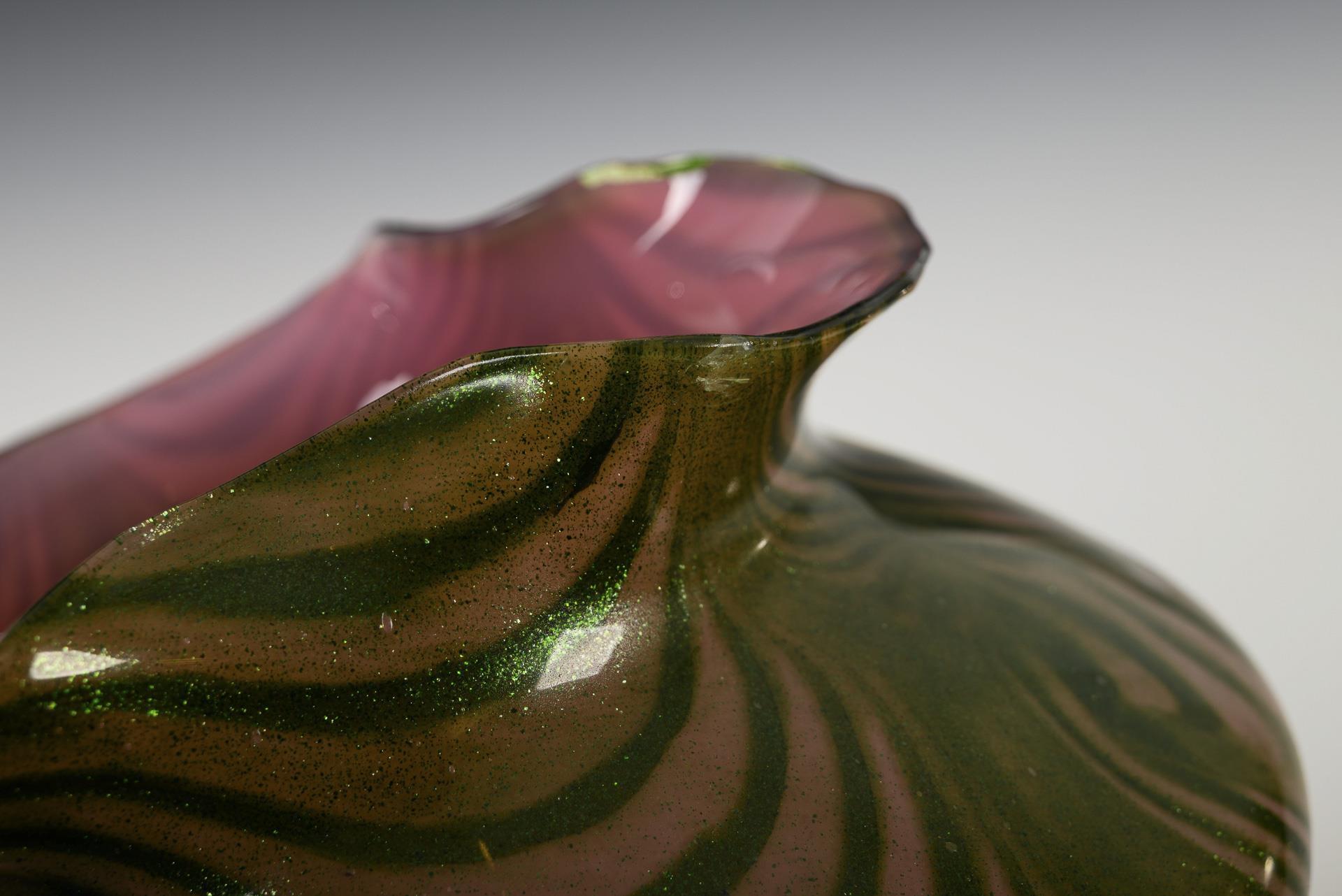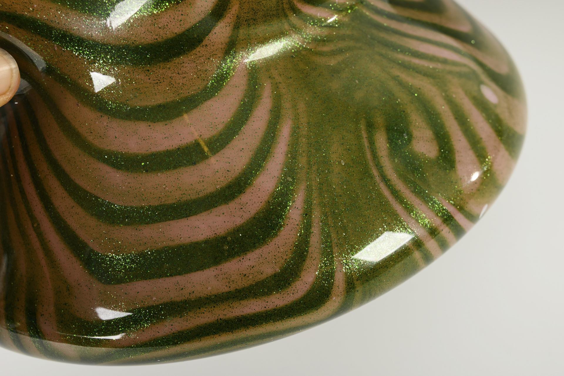 Colorless glass with pink-opal underlay and green aventurine threads in the middle layer, drawn out four times to form a feather-like pattern. H 11.5 cm, Ø 23.5 cm. 1.3 kg.