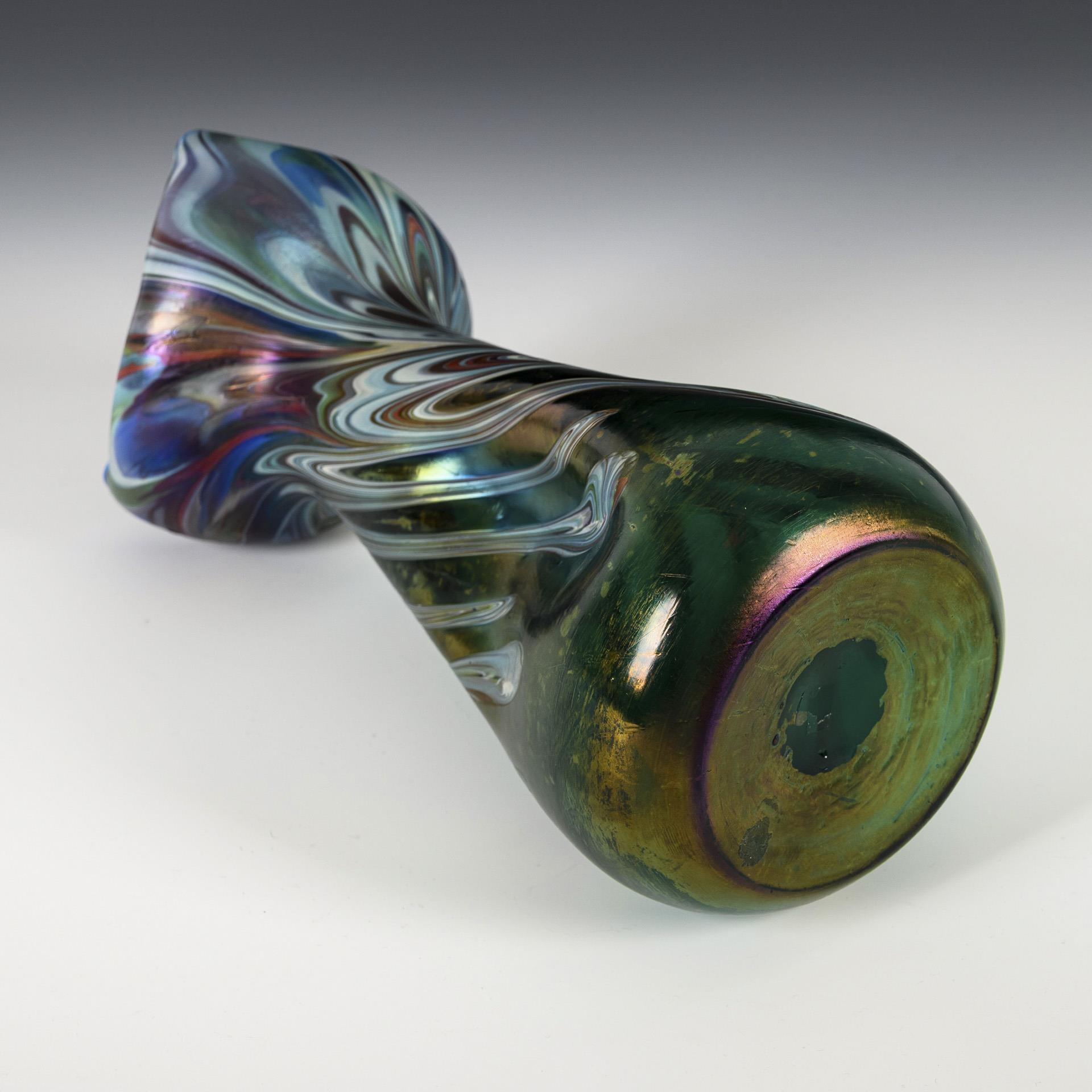 Green glass with striped marbled and multi-coloured threads twisted into long tongues, iridescent. H 28 cm. 825 g.