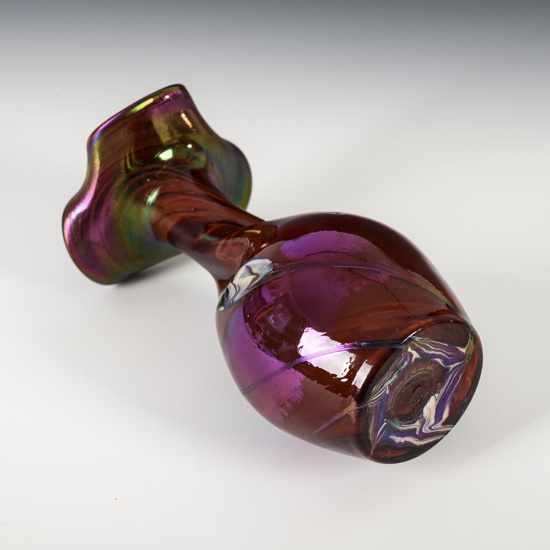 Clear red marbled opaque glass with a colourless top layer and five incorporated layers of warped opaque white and blue-violet glass threads, iridescent. H 23 cm. 540 g.
