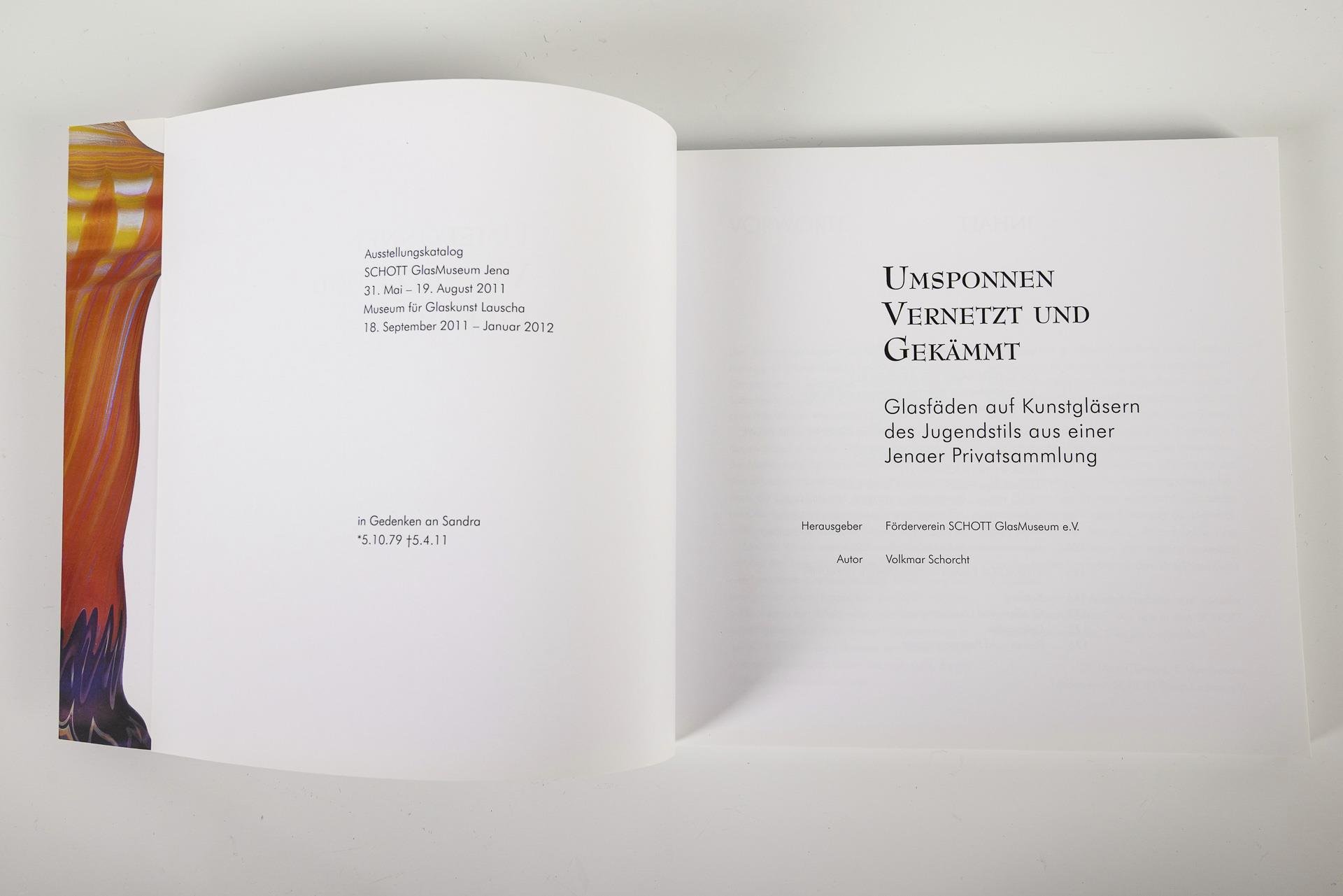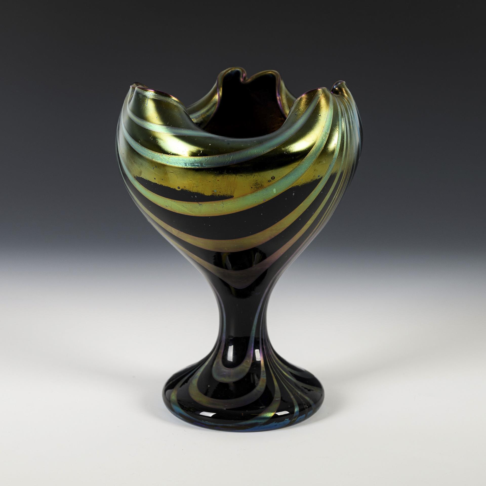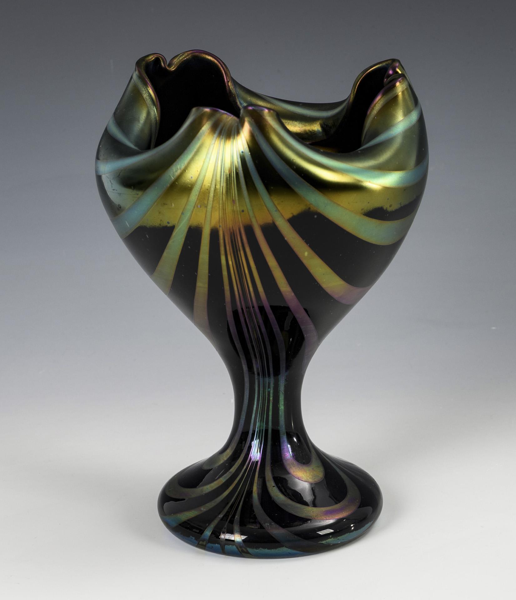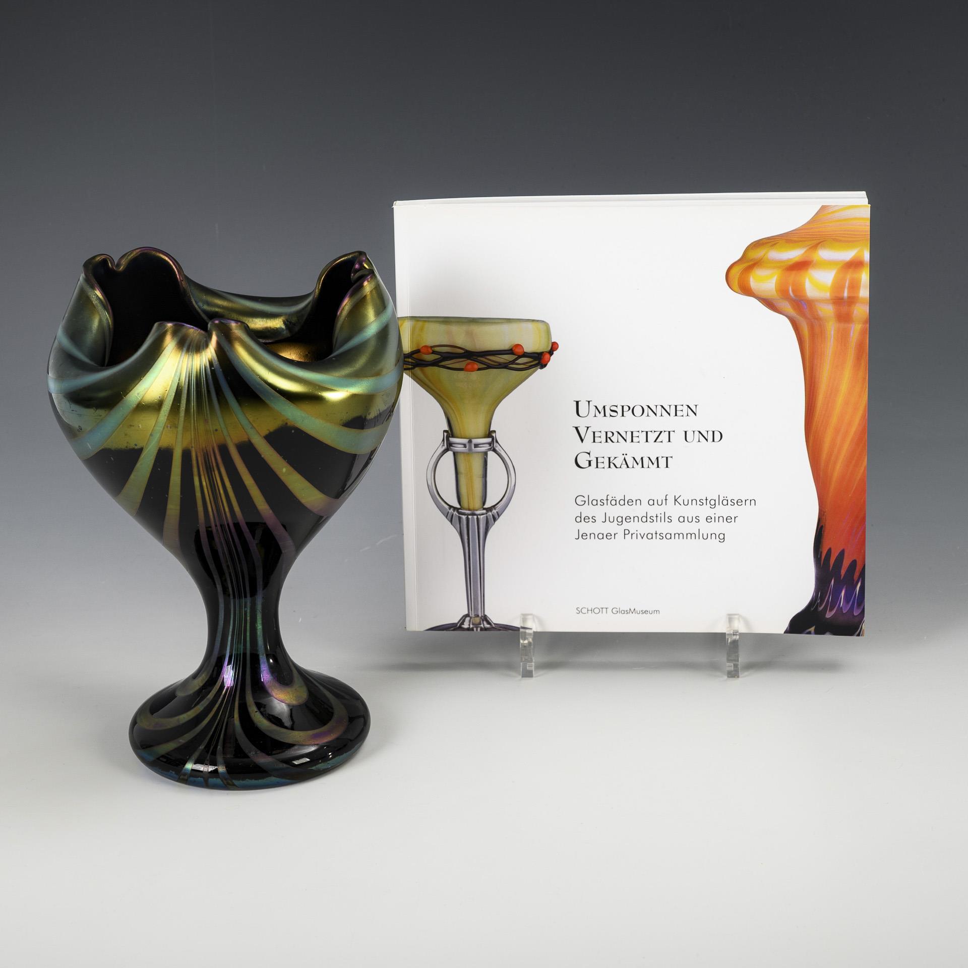 Goblet-shaped vase with a round base and triple, strongly inwardly lobed and pinched mouth. With reference book: Schorcht, Volkmar, Umsponnen, vernetzt und gekämmt. Glasfäden auf Kunstgläsern des Jugendstils aus einer Jenaer Privatsammlung, exhibition catalog SCHOTT GlasMuseum Jena May 31 - August 19, 2011 / Museum für Glaskunst Lauscha September 18, 2011 - January 2012, Jena 2011, 176 pages.