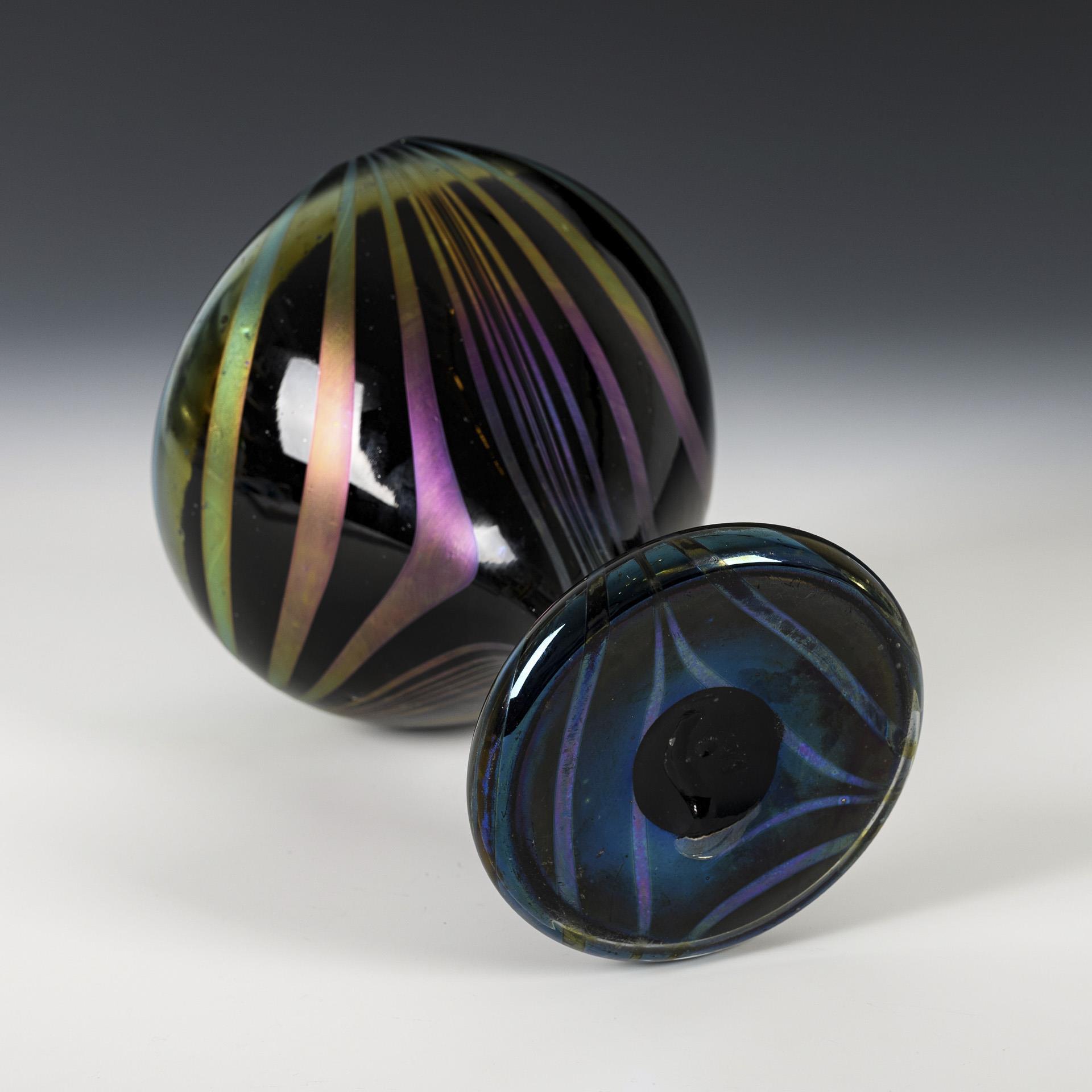 Clear glass with violet underlay and bronze-coloured iridescence. On the clear glass layer smoothly worked threads, twisted into symmetrical arcs, iridescent. H 22.5 cm. 910 g.