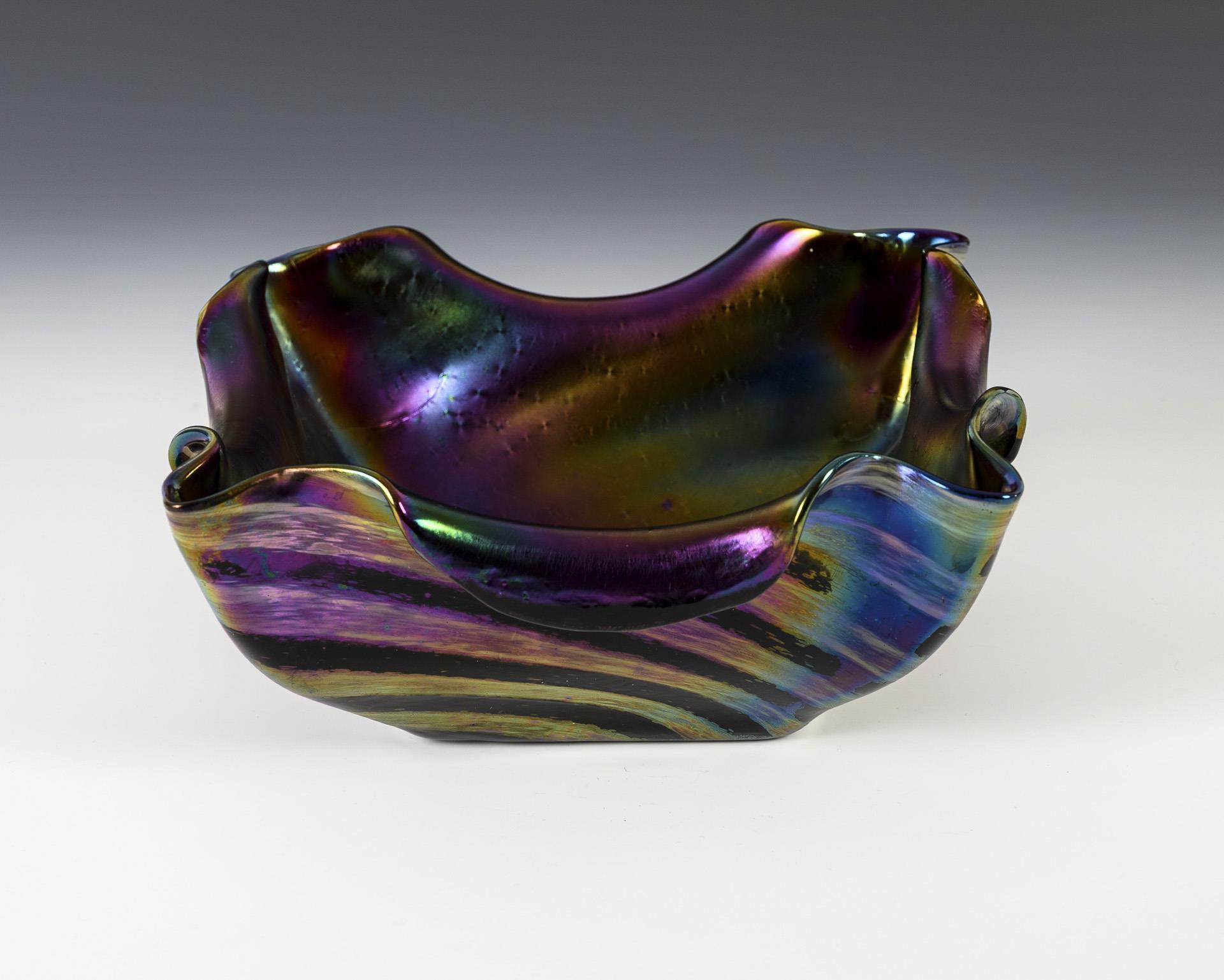 Colourless glass with ruby red underlay, spirally folded bands of silver-yellow powder, matt gold-violet iridescence. H 16 cm, 23.5 x 23 cm. 1.2 kg.