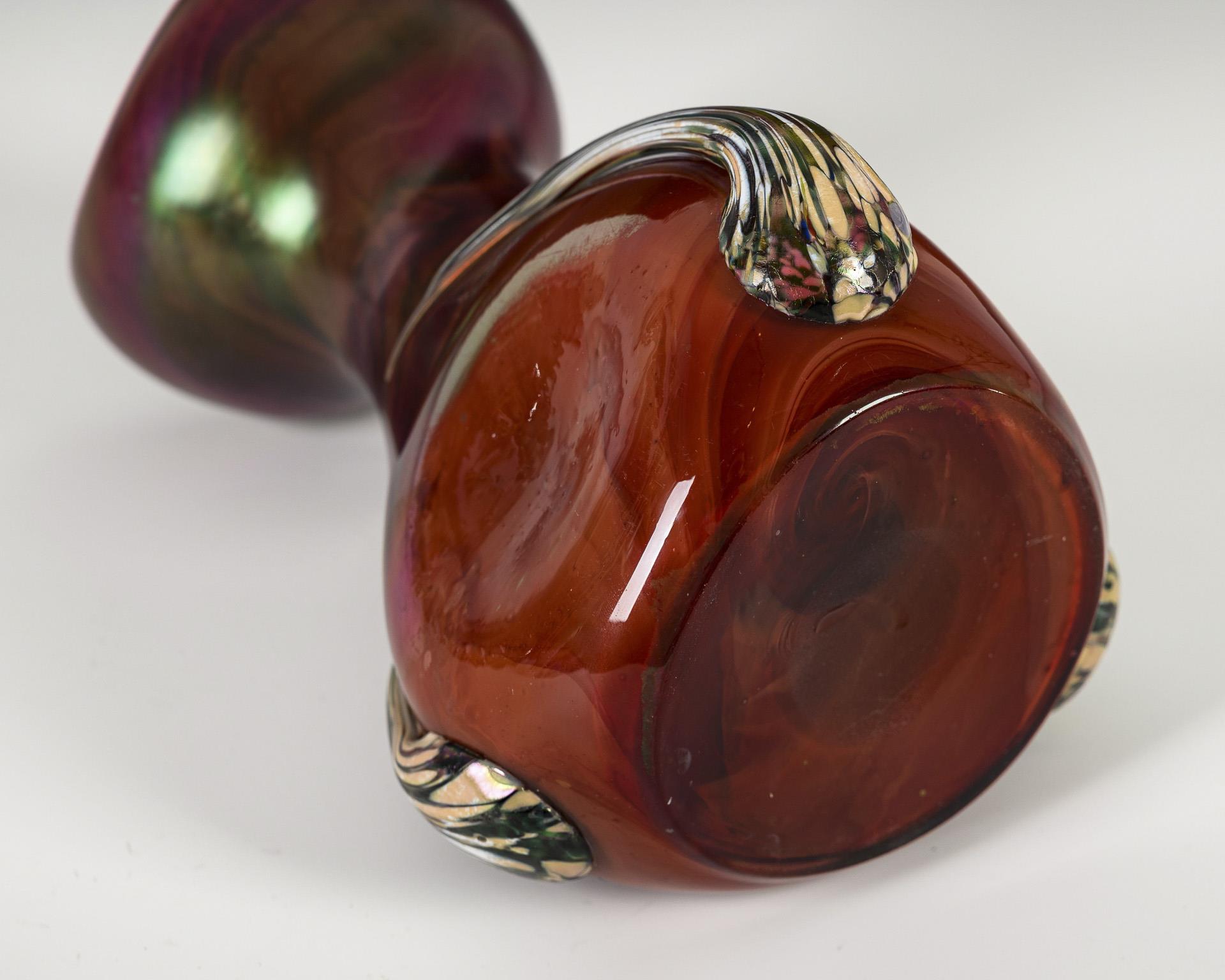 Very red, marbled glass with colourless top layer, iridescent. H 18.5 cm. 495 g.