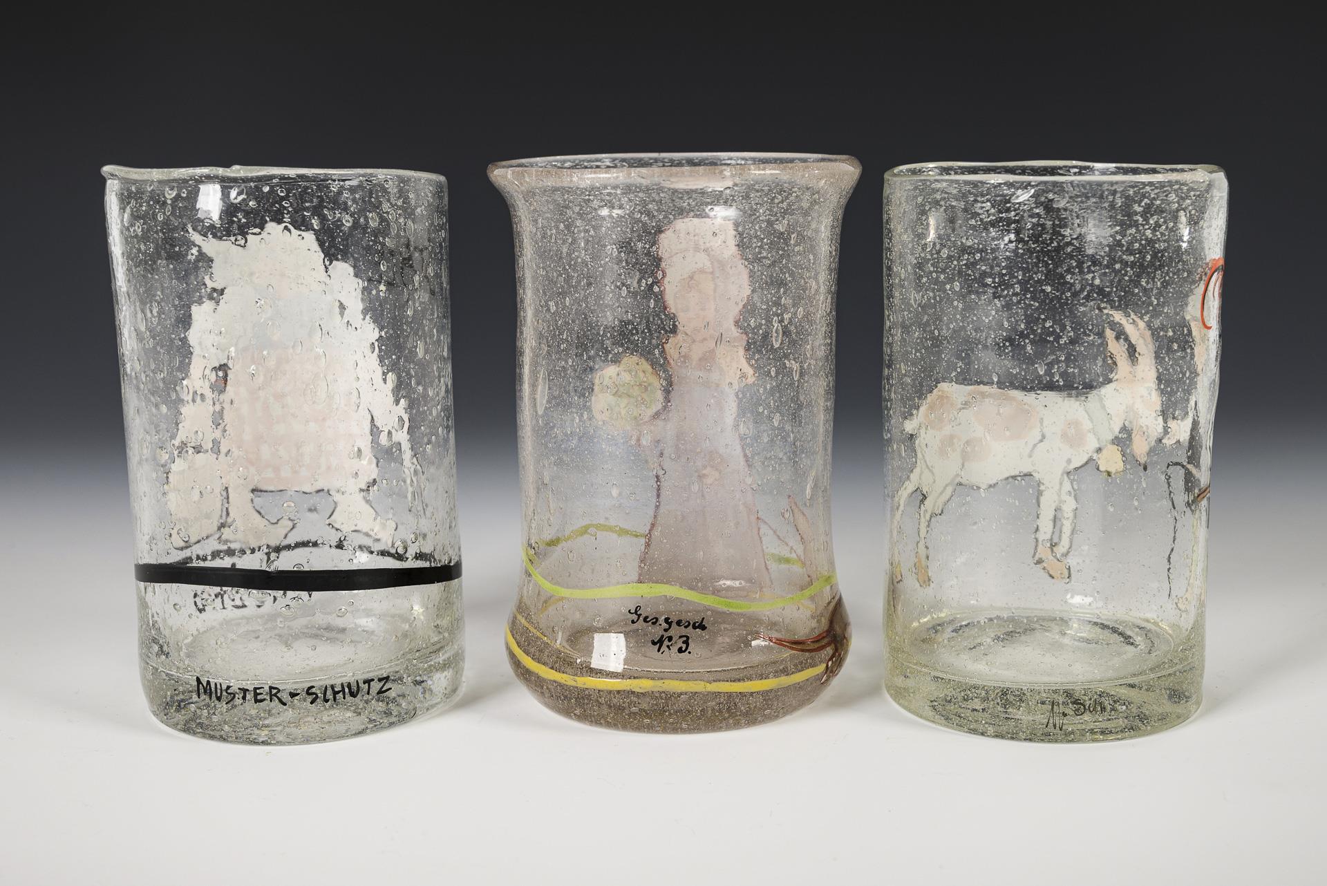 Mainly cylindrical goblets with various motifs: Biedermeier girl with dachshund (marked "Ges. gesch. No 3."), shepherd boy with goat (marked "M. Sch.") and peasant woman with milk pail (stable milieu, marked ("Muster-Schutz").