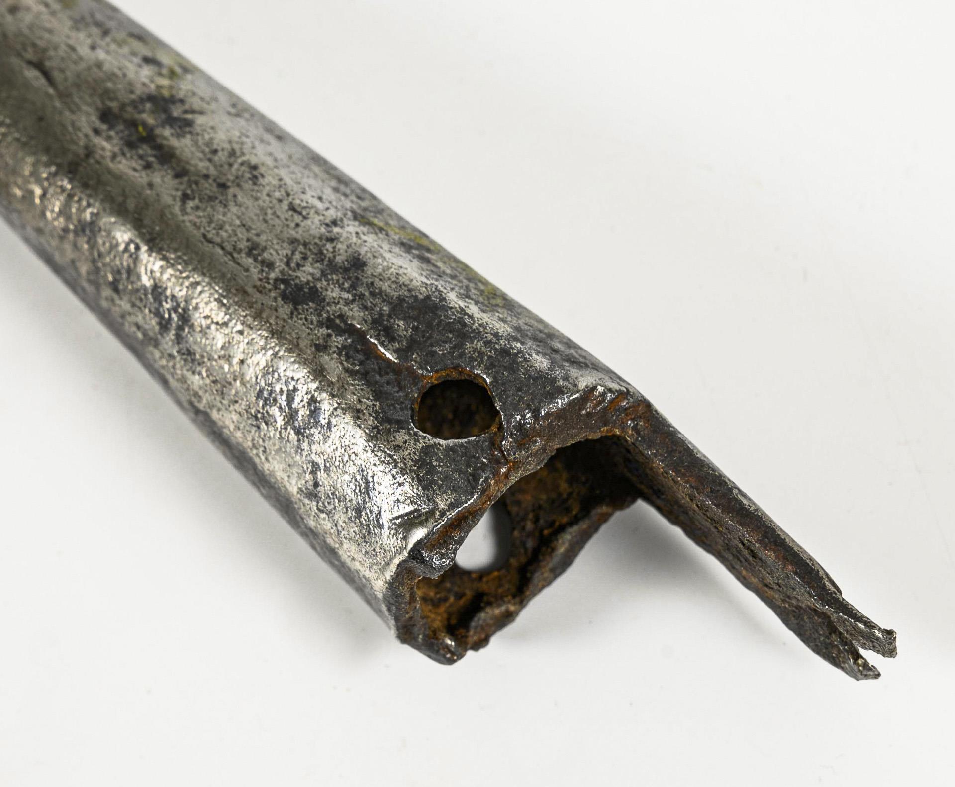 Blade and socket forged from one piece. Lance part with central ridge, wing parts with perforated pattern. Extension for shaft attachment broken off. Corrosion scars.