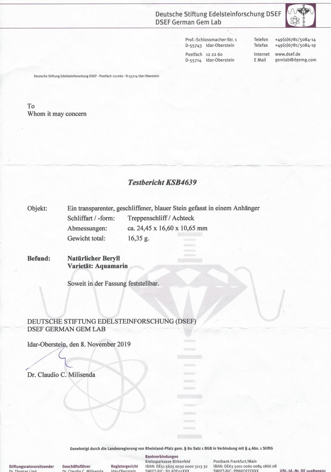 Marked yellow gold 585. Pendant 4 x 3 cm, aquamarine 24.45 x 16.60 x 10.65 cm. 16,3 g.