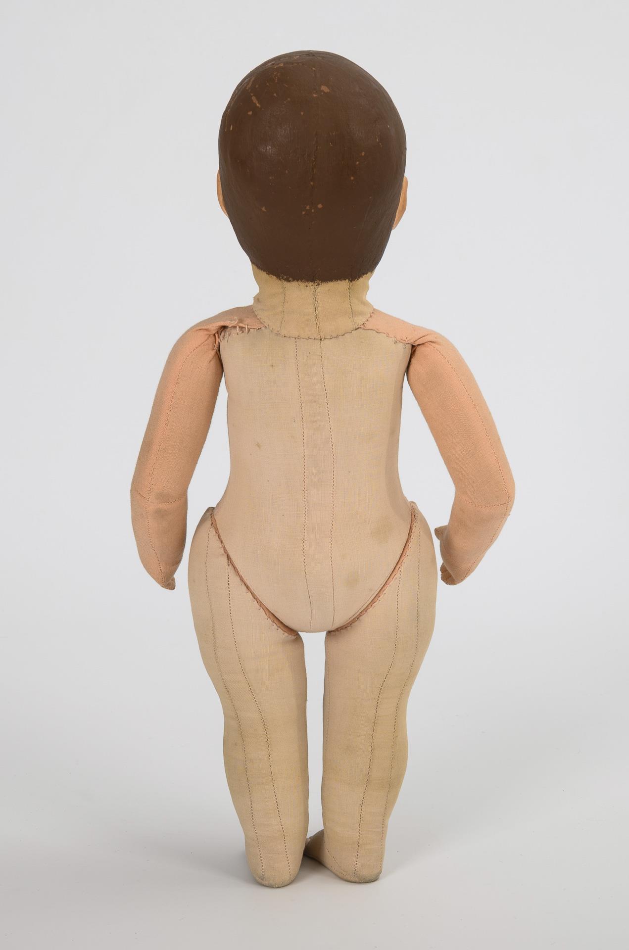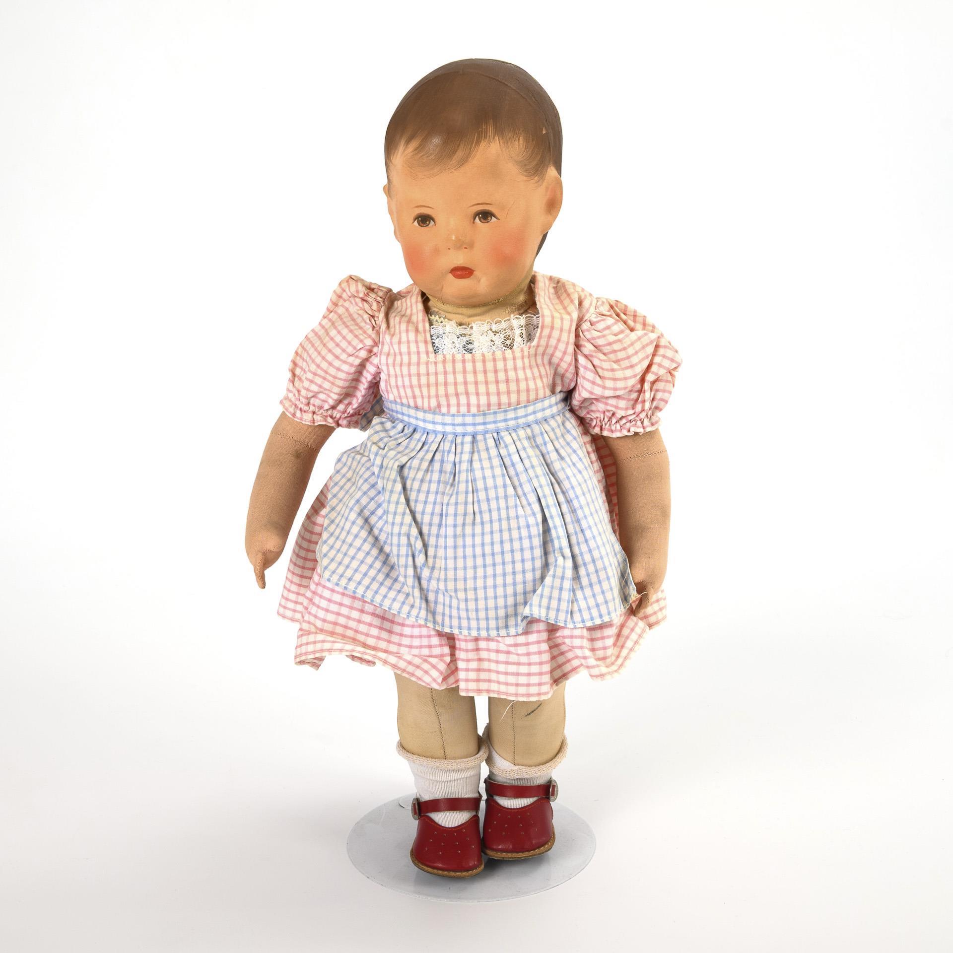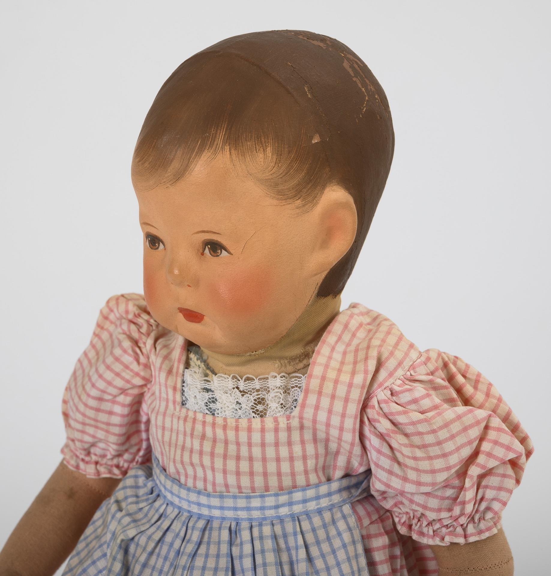 Type I. Sewn fabric head with mask-like painted face and 3 seams at the back of the head. Cloth body with wiggly arms and wide hips. Pink checkered dress with blue checkered apron (re-sewn in the 1950s), red leather shoes. Paint chipping on the top of the head, body minimally soiled.