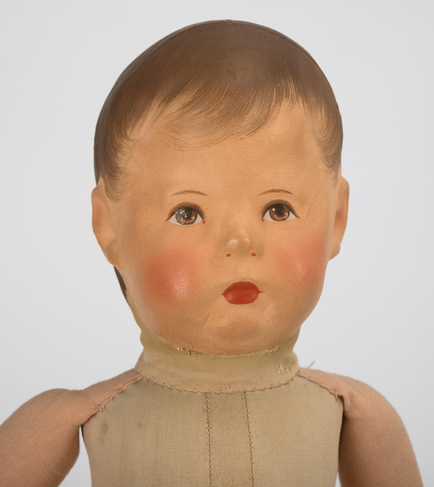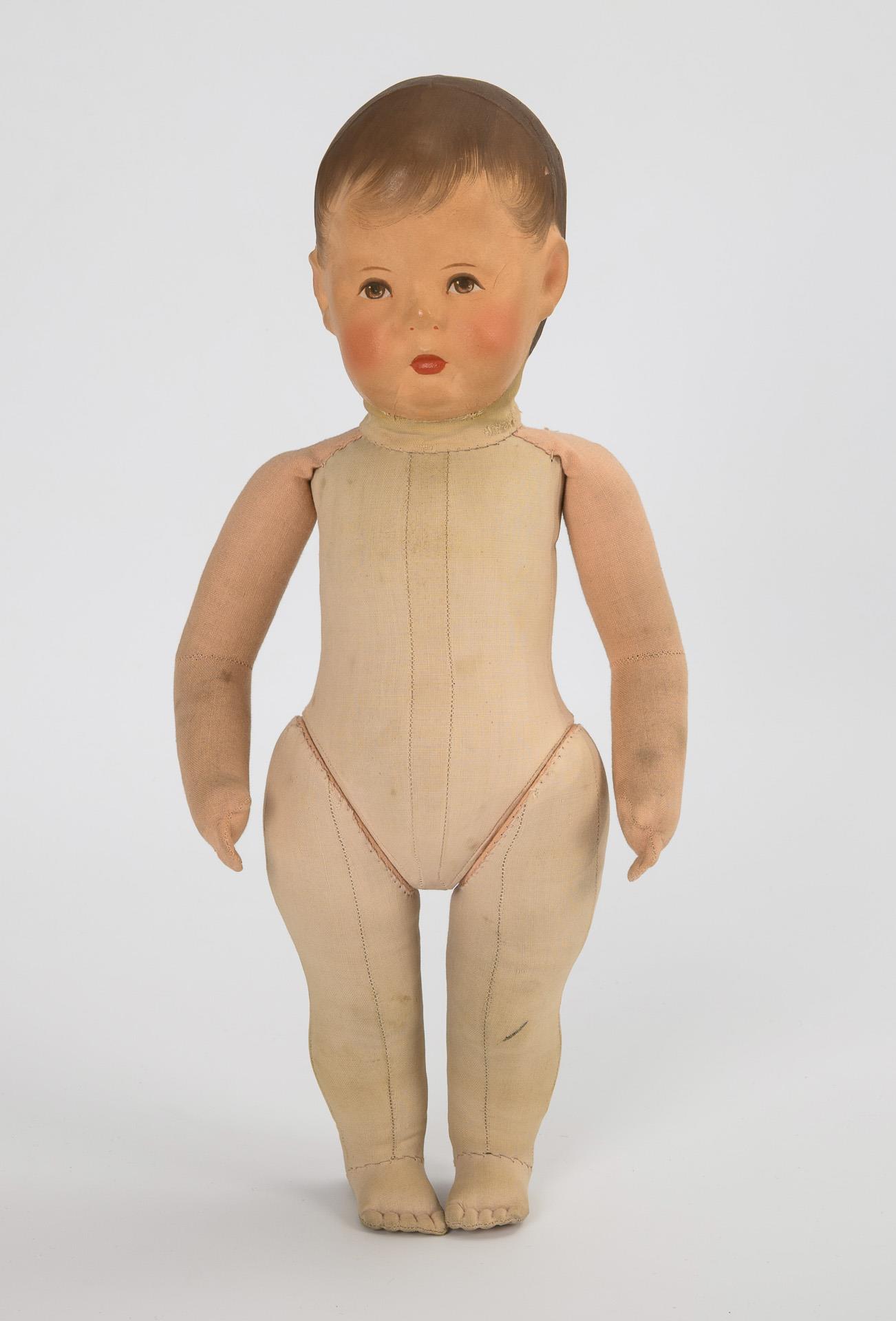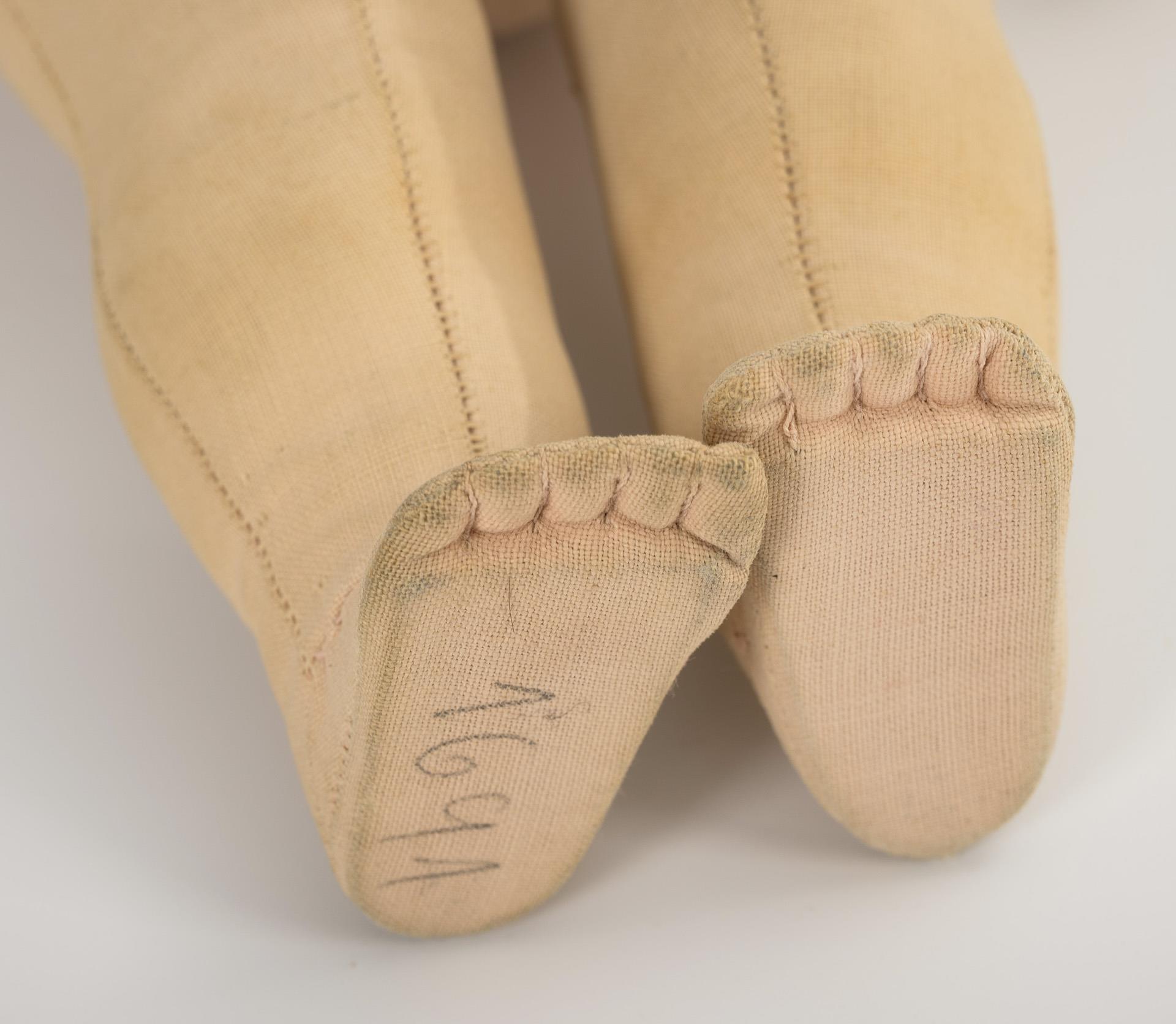 Type I. Sewn fabric head with mask-like painted face and 3 seams at the back of the head. Cloth body with wiggly arms and wide hips. Pink checkered dress with blue checkered apron (re-sewn in the 1950s), red leather shoes. Paint chipping on the top of the head, body minimally soiled.