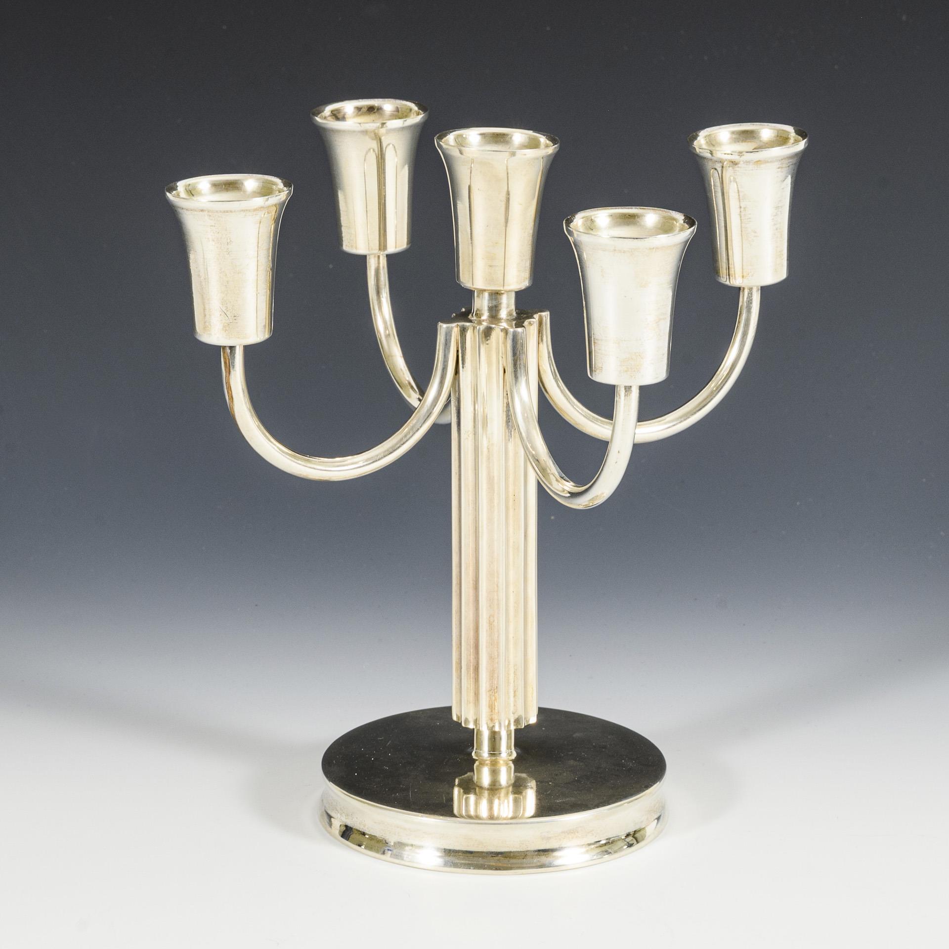Elegant candlestick with fluted shaft and four u-shaped curved arms. Signs of wear, probably production-related holes and soldered areas on the spouts.