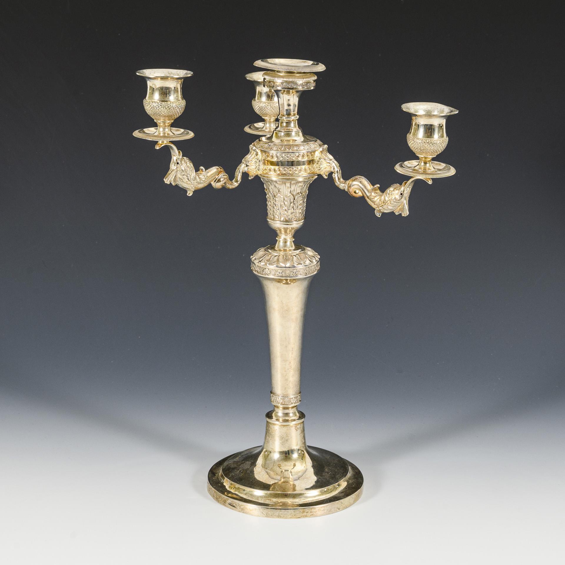 4-light candlestick with 3 sculpted dolphin arms and foliage in relief. 2 arms with break at the base, 1 arm soldered. Shaft minimally dented.
