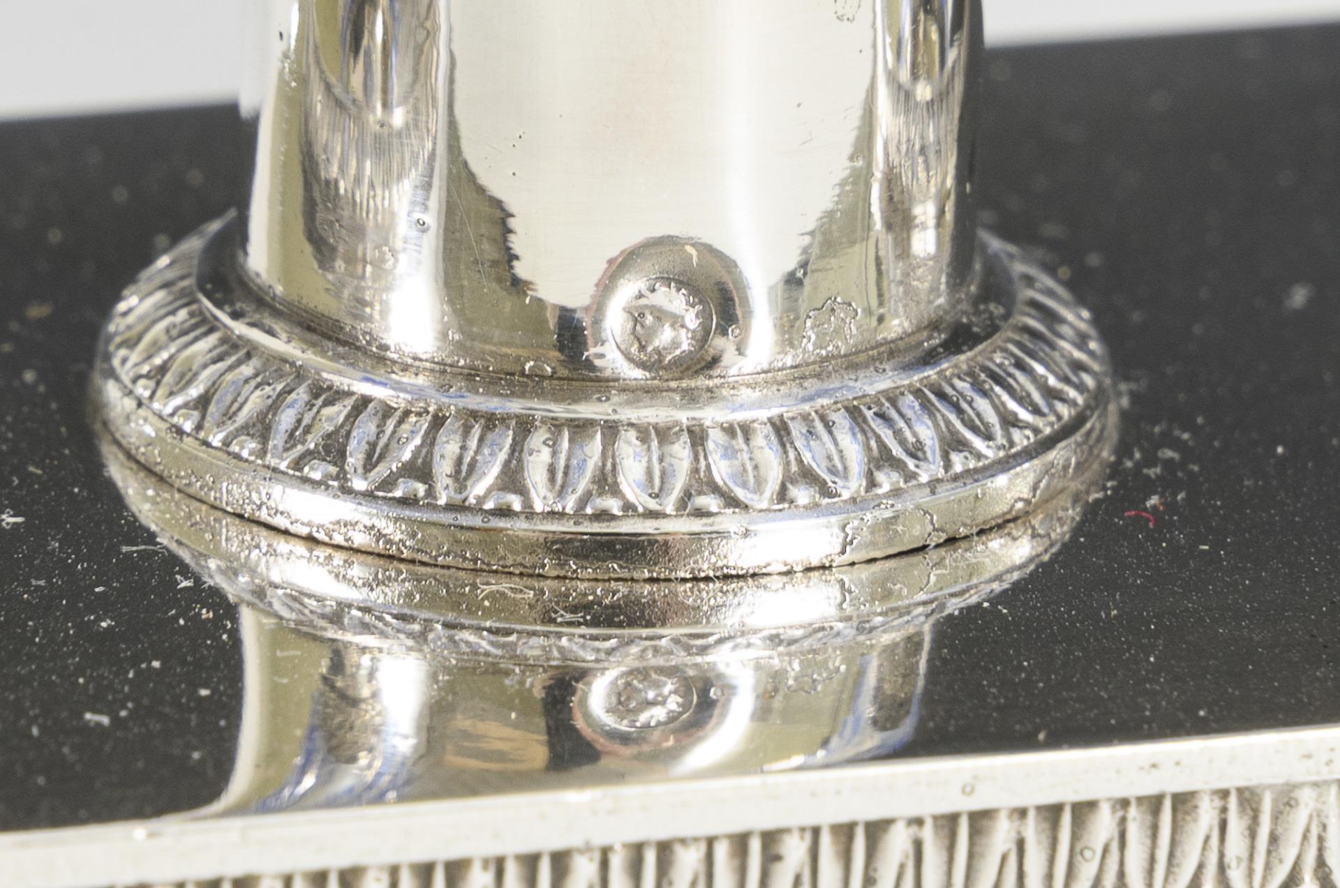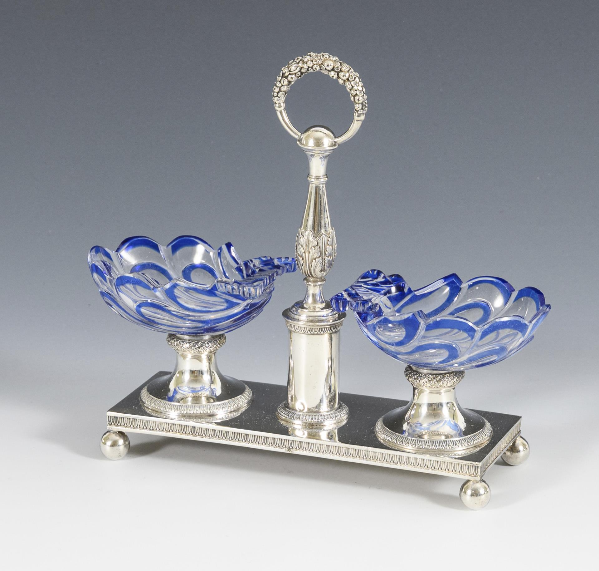 Elegant cruet with ring-shaped handle and 2 shell-shaped blue and white glass bowls.