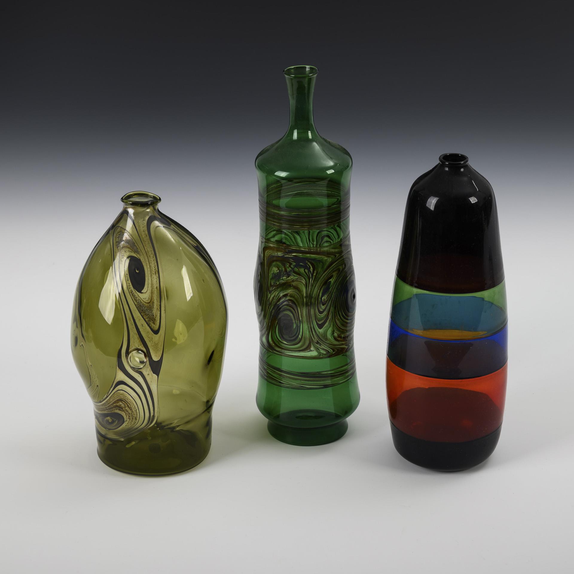 1x bottle in green glass (H 26 cm). / 1x olive green glass bottle (H 18 cm). / 1x violet, green, blue and red glass bottle (H 22 cm).