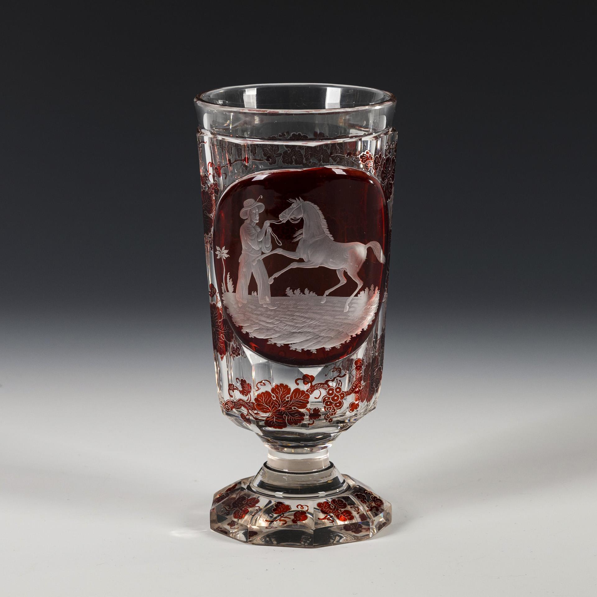 Goblet glass with horse motif.
