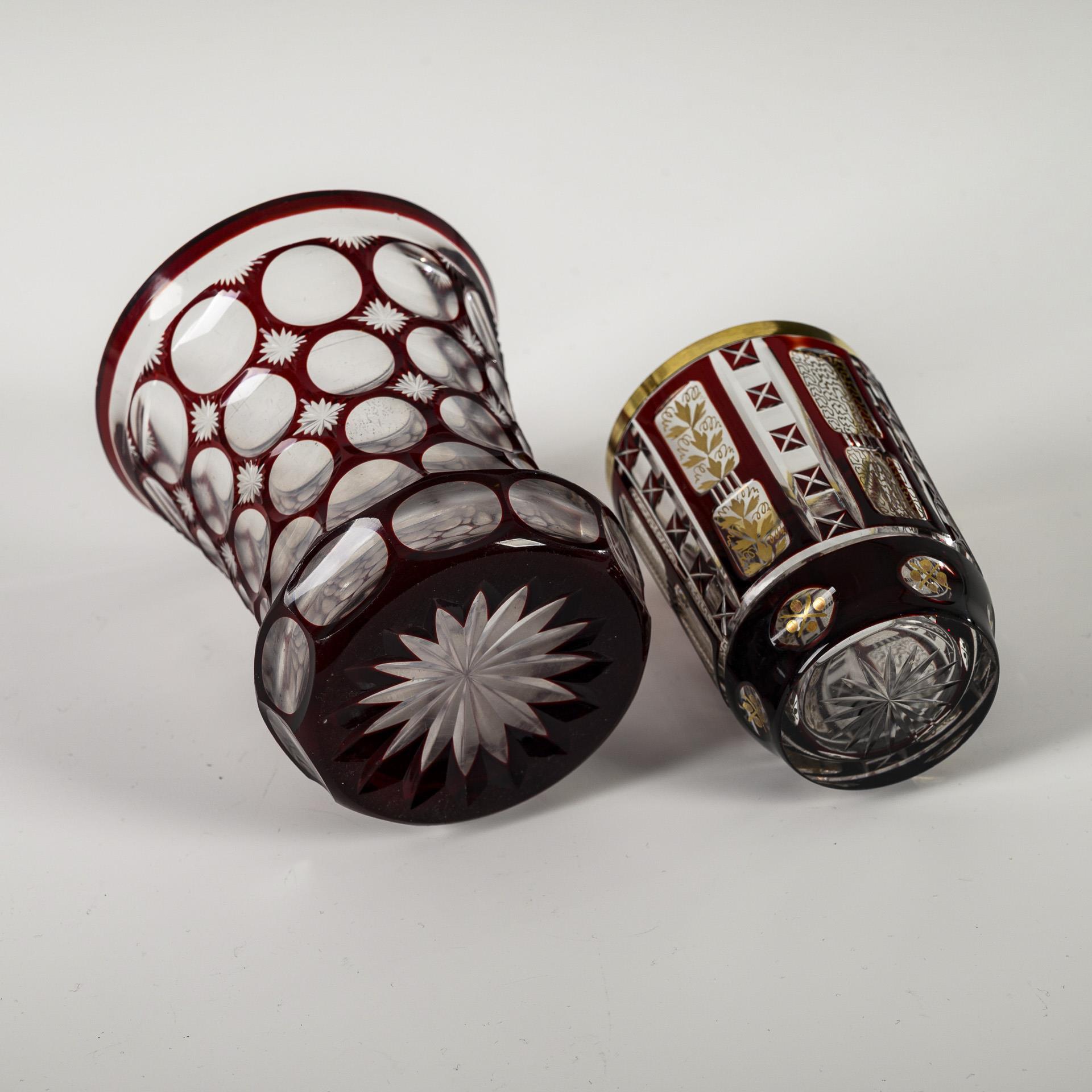Colorless glass with ruby red overlay, 1x gold-decorated. H 11 and 8.5 cm. 400 g.