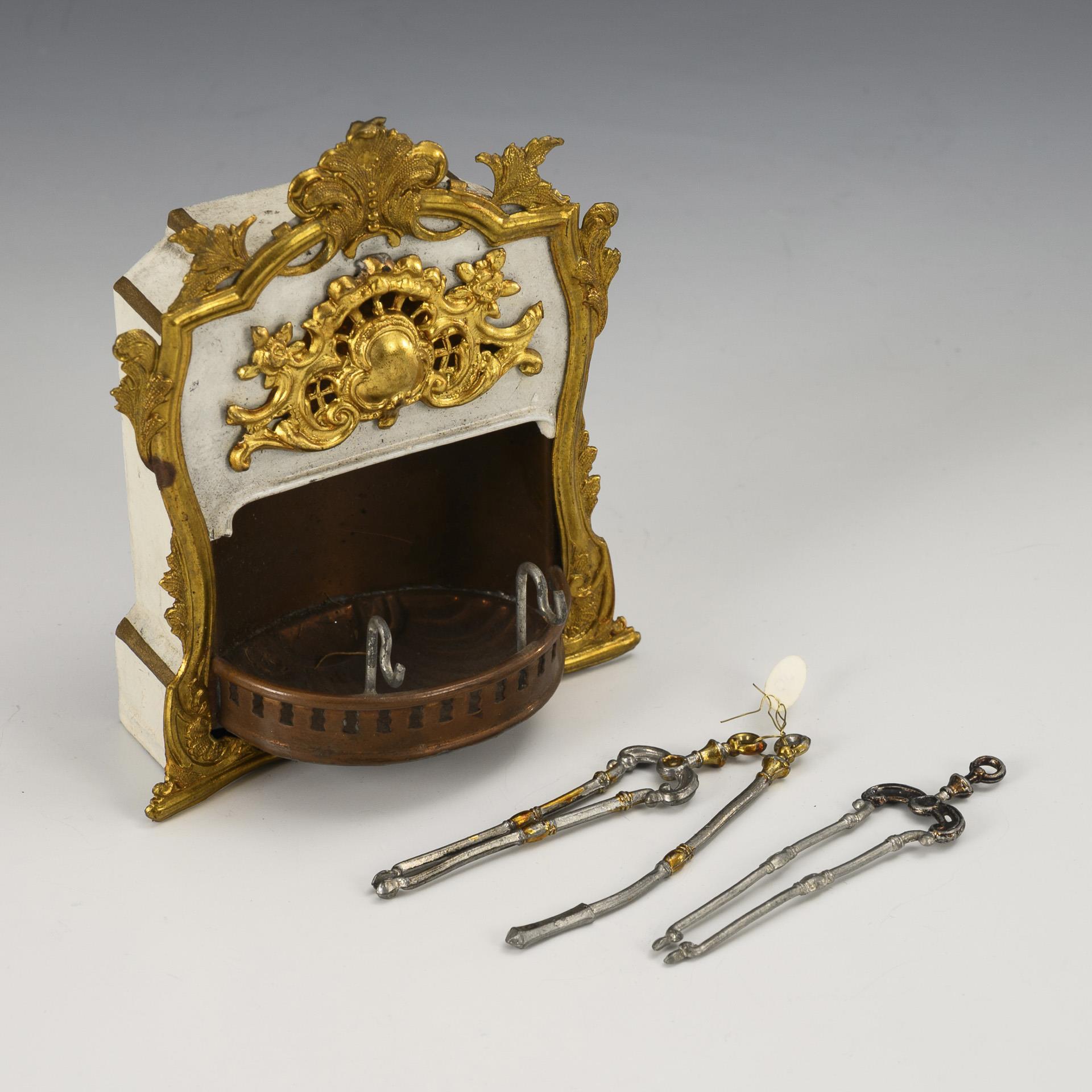 White lacquered sheet metal fireplace with rocaille decoration. Comes with 3 pieces of pewter fireplace cutlery.