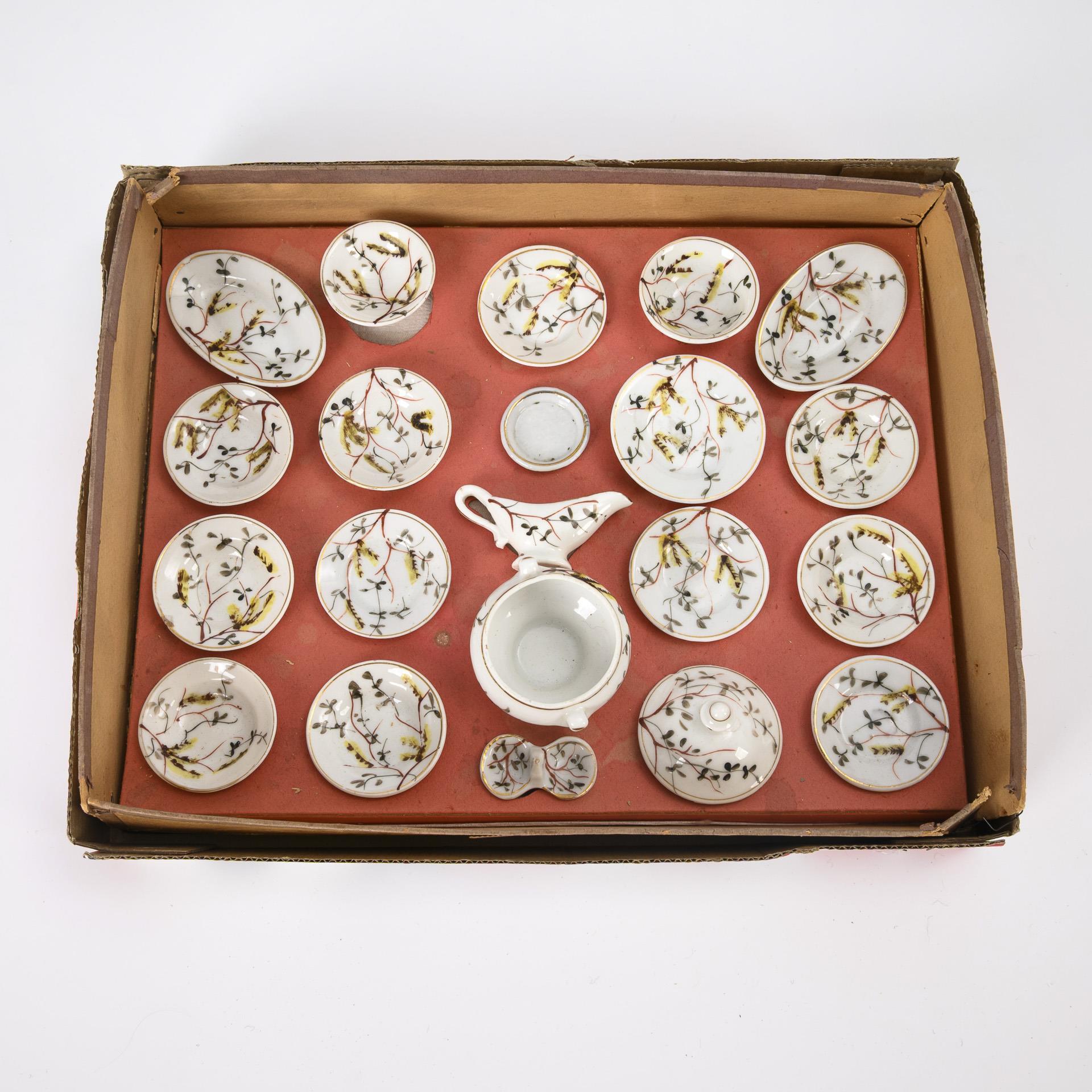 20-piece doll service in original box without lid. Marked on the box: "Tafel-Service, Dinner-Set, Nr. 44, Decor 3753". Few small knocks. Cardboard box defective.
