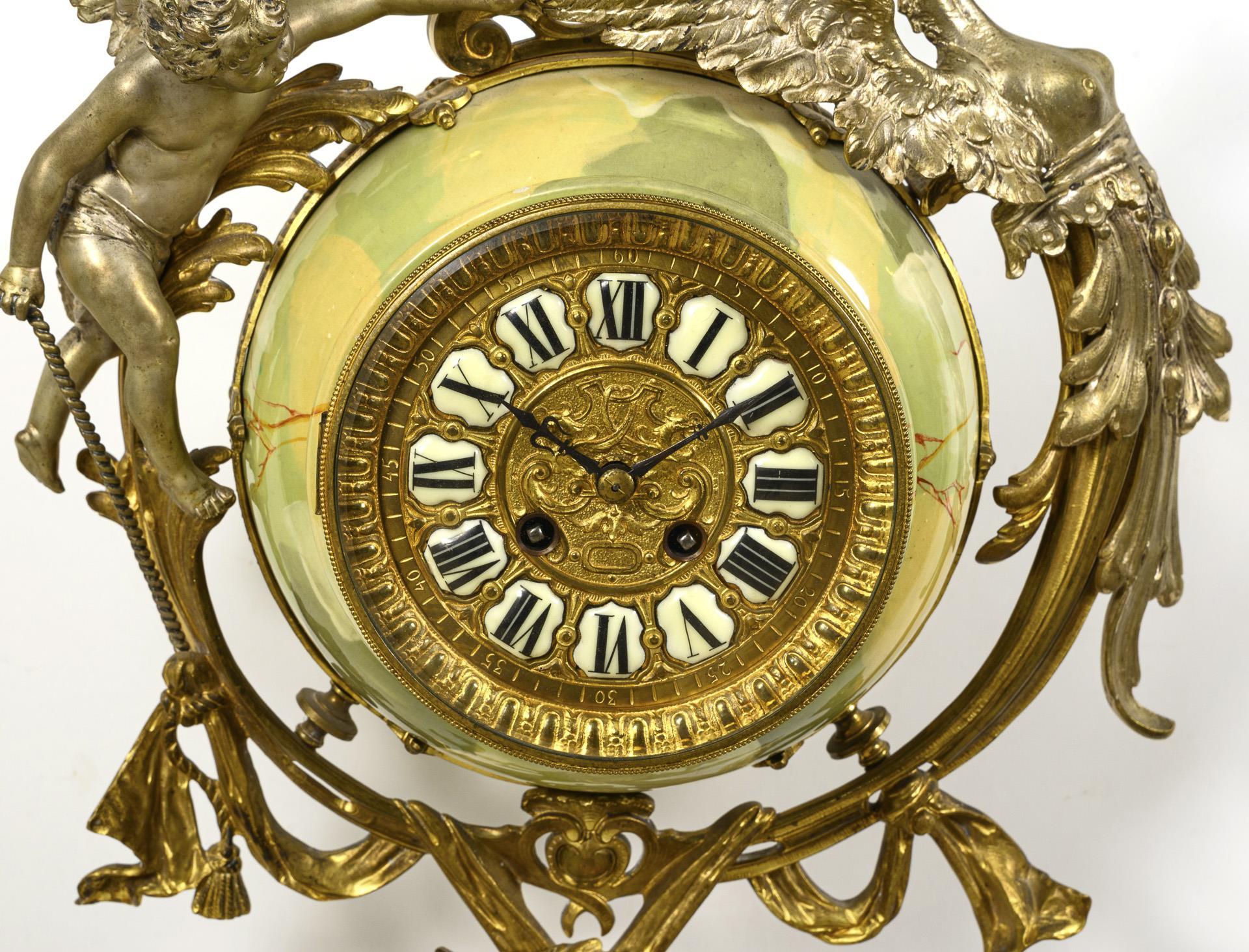 Historism clock with a finely designed bronze mount with rocailles, shells, foliage and musical instruments. Hanging clock body with a sculpted angel and a winged griffin herm. Minimal signs of age and wear.