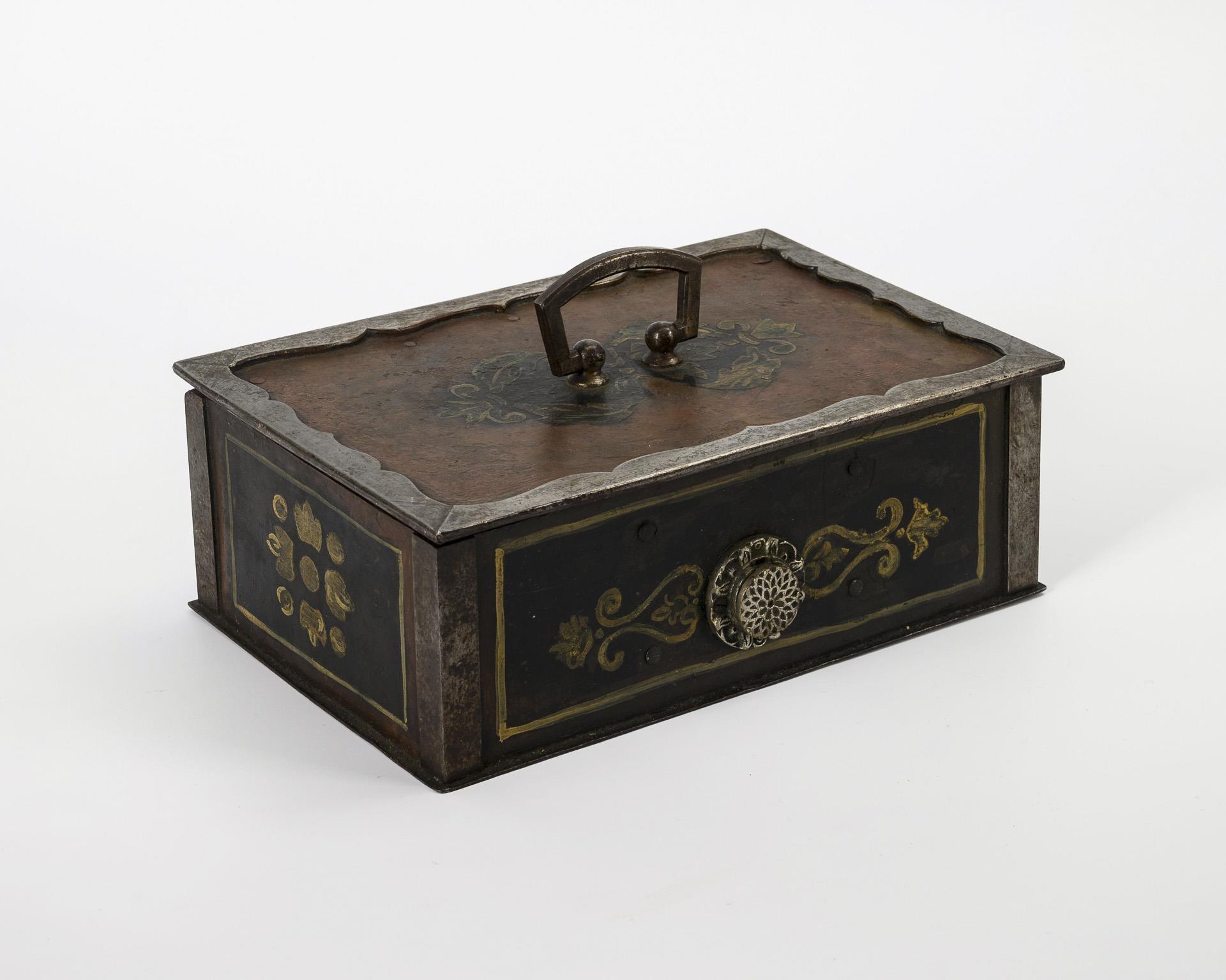 Probably a cash box in cuboid form with reinforced corners and curved band reinforcements on the edges of the hinged lid. Decorated keyhole panel with cover on the front, hinged carrying handle on the lid. Painted mock cassettes on all sides with vegetal ornamentation in the center. Largely overpainted, slightly corroded, cannot be opened.