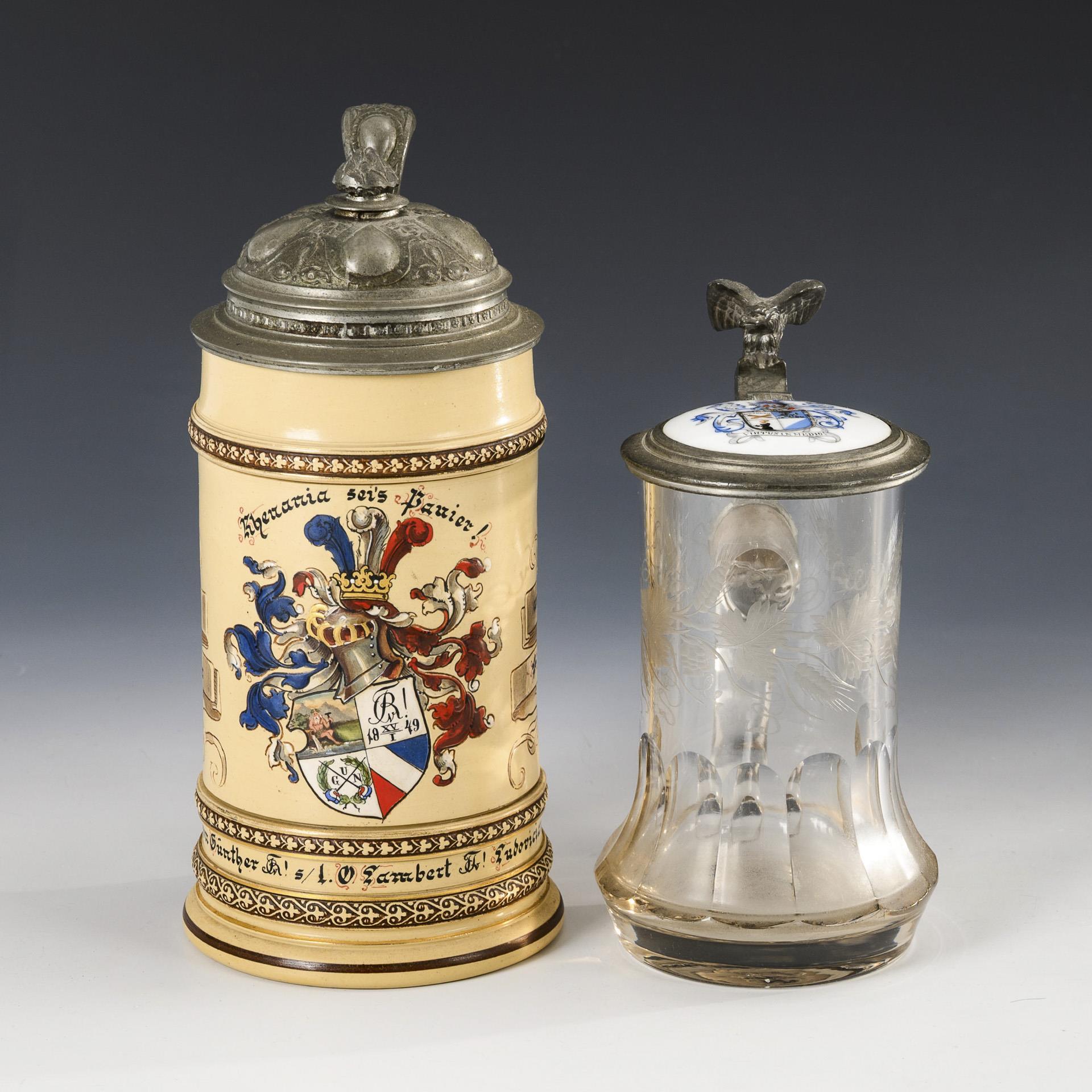 Ceramic jug with the Rhenania Heidelberg coat of arms in relief; dedication below / Faceted cut glass jug with vine leaves and porcelain plaque on the pewter lid with eagle pusher. Painted coat of arms of the "Erlanger Pfarrerstochter" association on the plaque, dedication by Dr. Ebers to Dr. Lambert. 1 nick to the pewter lid. / Chips to the glass, solder repair and slight nicks to the pewter lid.