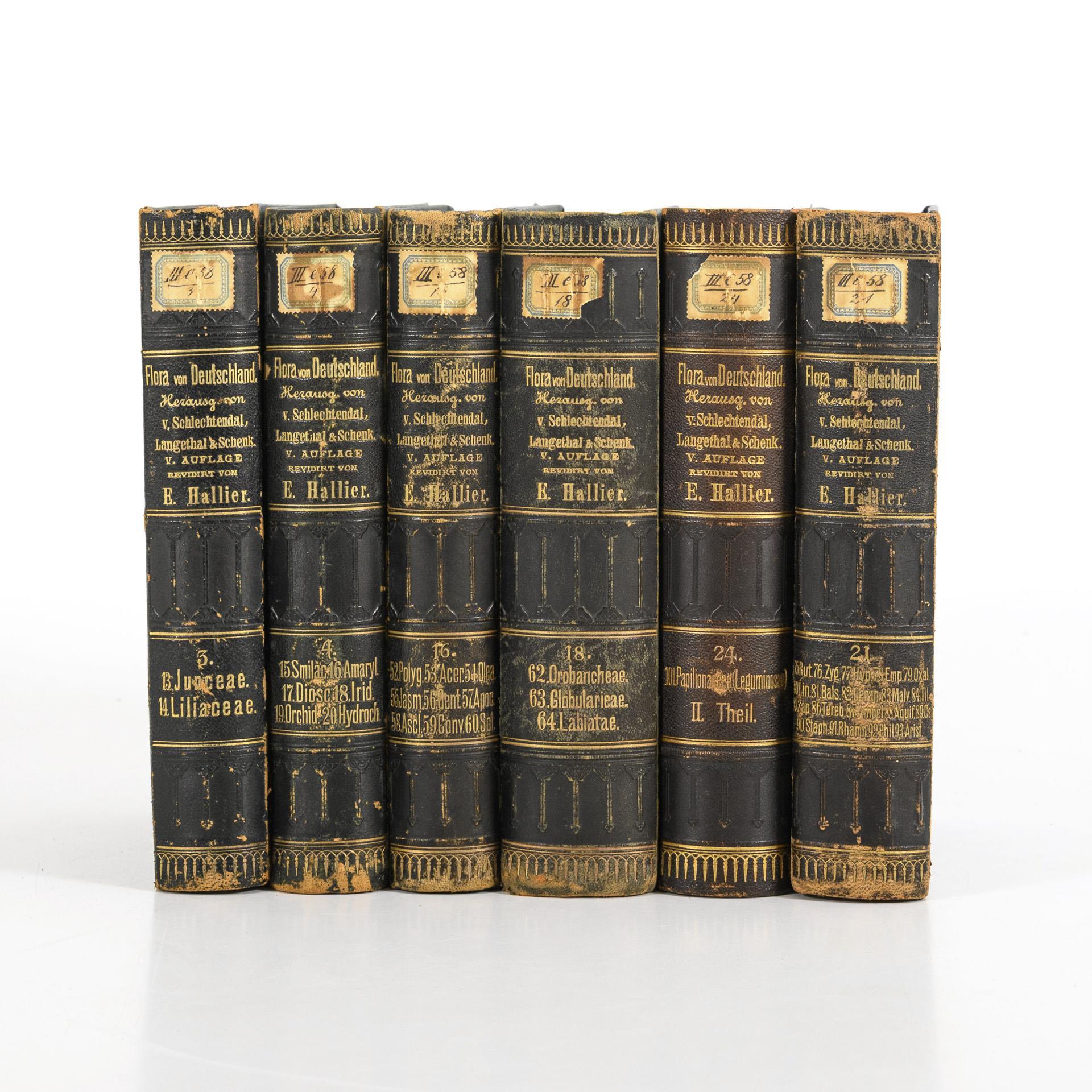 5th edition. 6 of 31 volumes: Volumes 3, 4, 16, 18, 21, 24, in gilt-stamped half leather binding, with numerous colored lithographs. Signs of age and wear, library labels on spines.