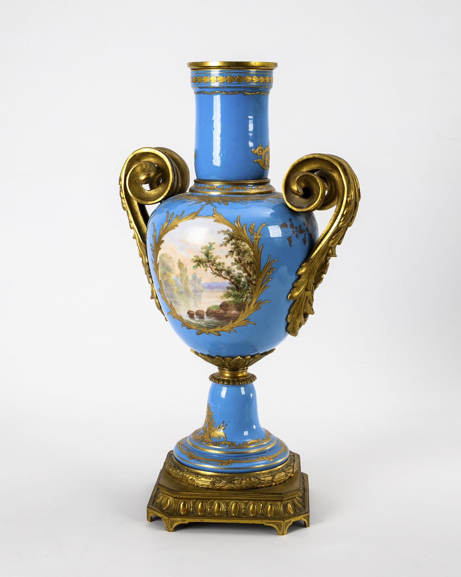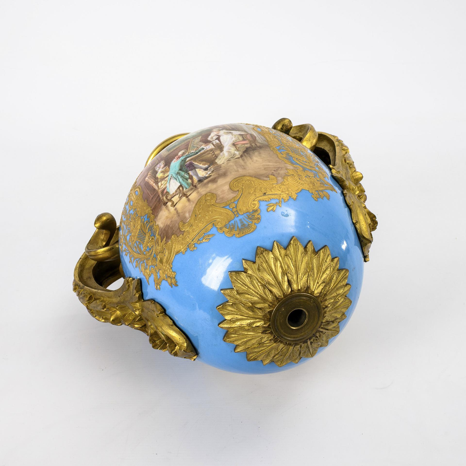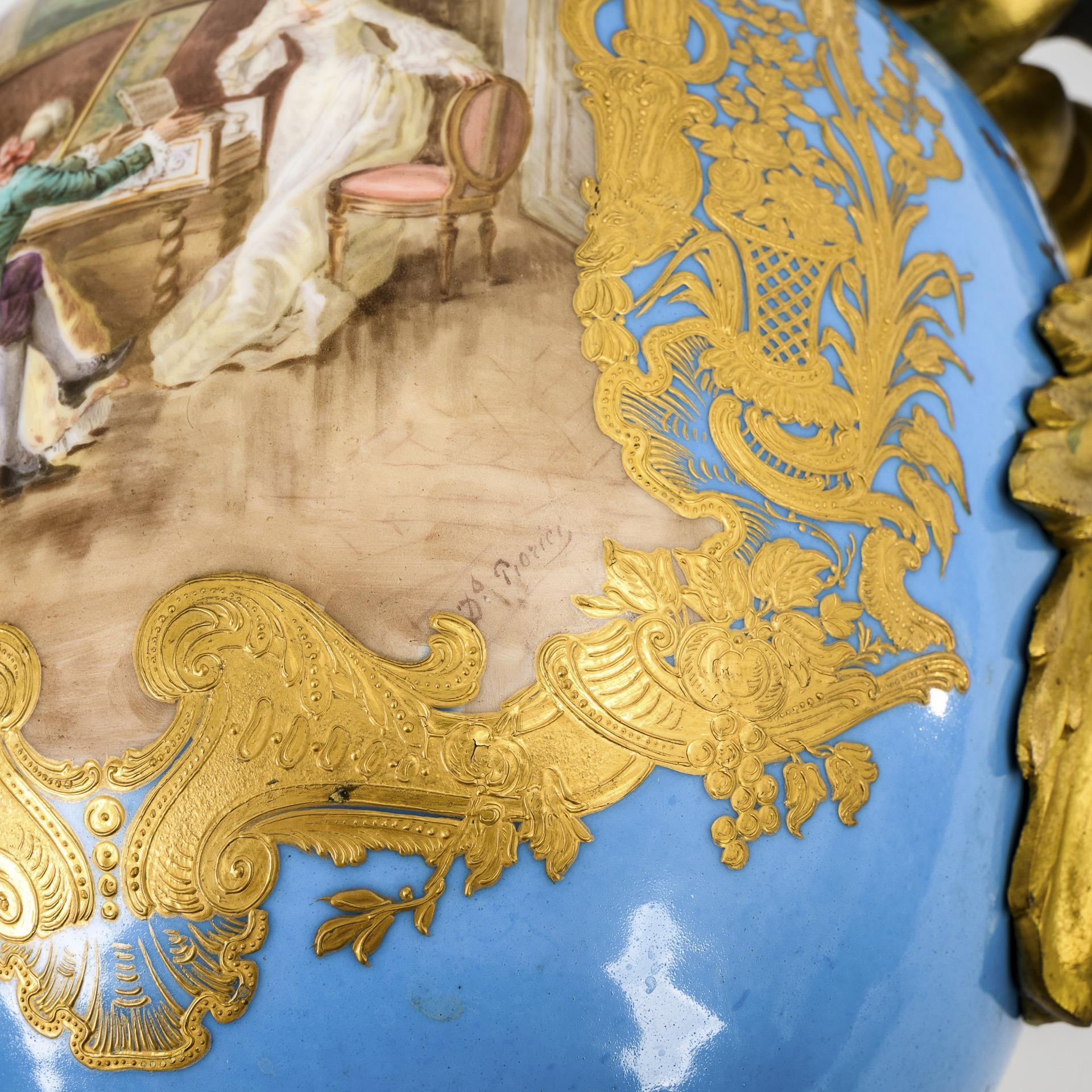 Ovoid body with bronze-mounted leaf handles and bell base, mounted on a square bronze plinth with laurel wreath and egg-and-dart frieze. Turquoise blue background with rich floral-ornamental gold painting over relief paste. A cartouche on the front depicting a rococo couple paying homage to the bowing harpsichord player, landscape painting on the reverse.