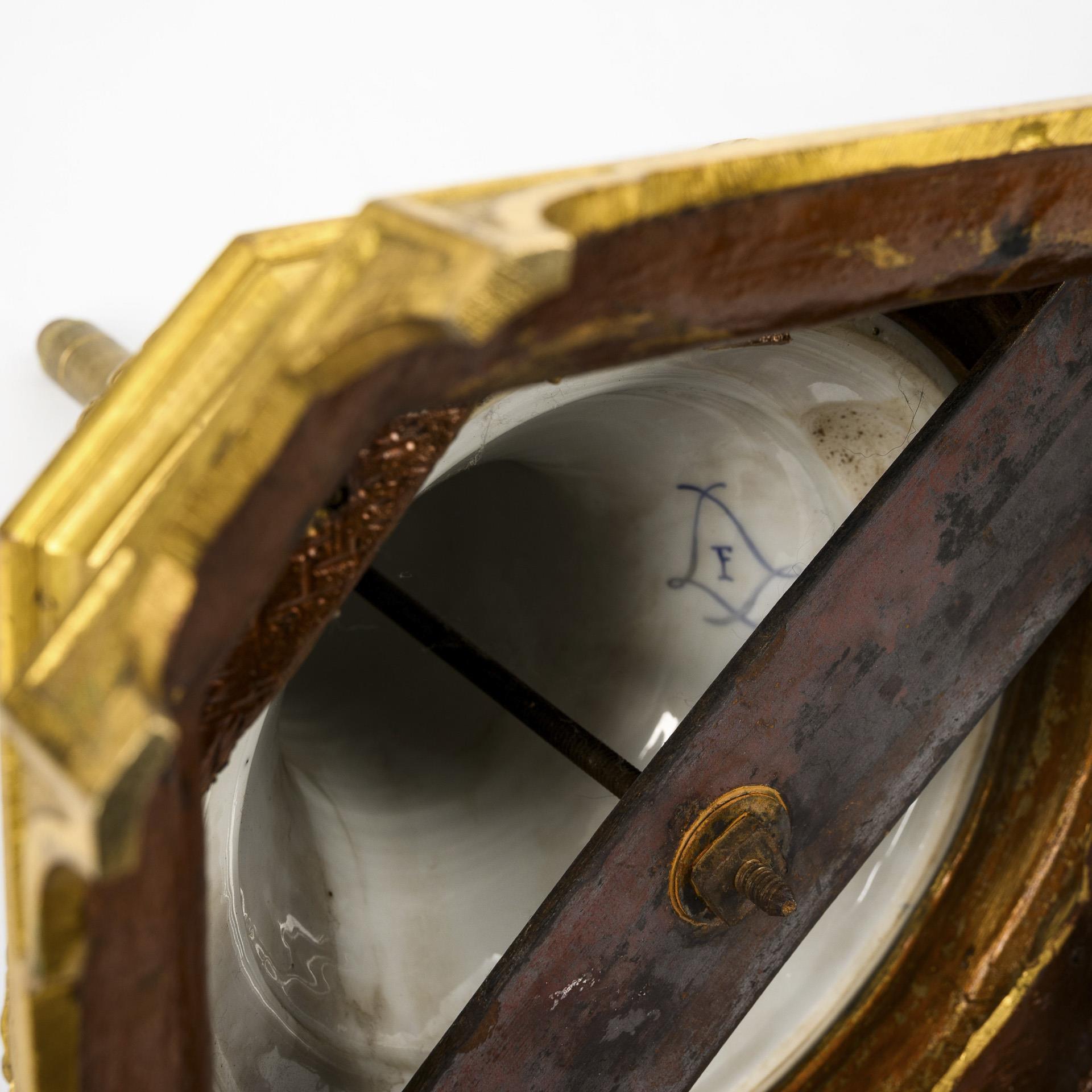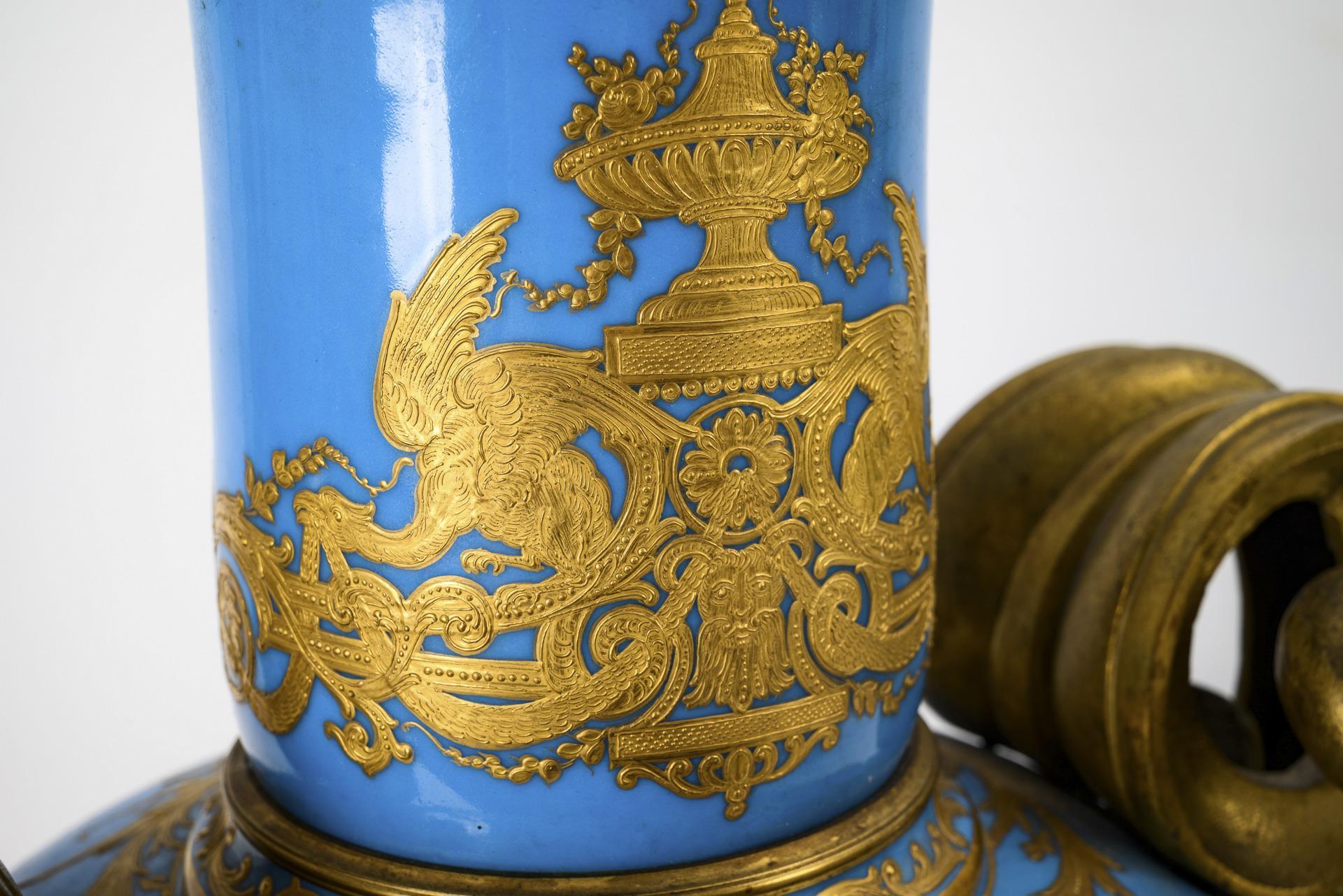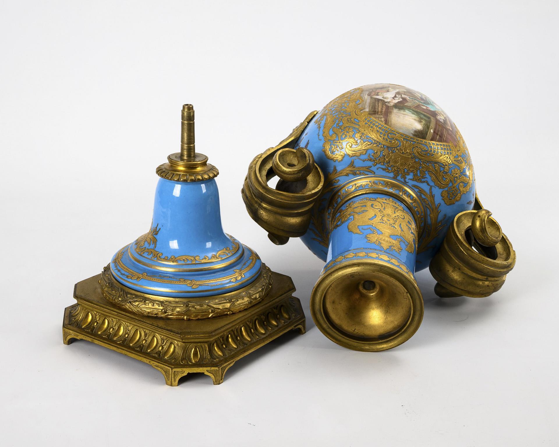 Ovoid body with bronze-mounted leaf handles and bell base, mounted on a square bronze plinth with laurel wreath and egg-and-dart frieze. Turquoise blue background with rich floral-ornamental gold painting over relief paste. A cartouche on the front depicting a rococo couple paying homage to the bowing harpsichord player, landscape painting on the reverse.