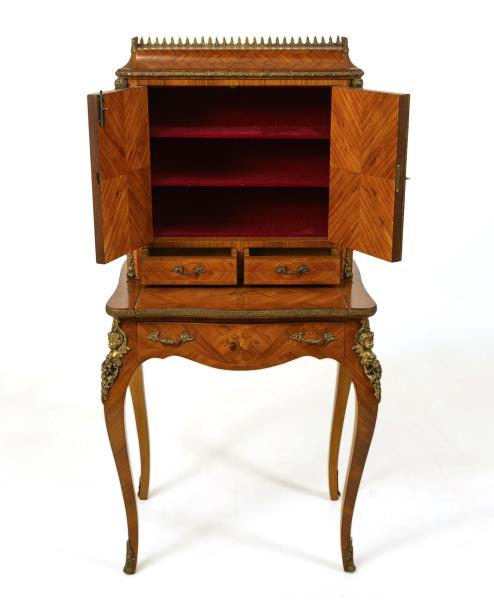 2-piece period furniture, consisting of a 2-door top cabinet with 2 plinth drawers and a 1-tier table with extendable writing surface and 4 curved pointed legs. Ornate veneer with floral inlays and thread inlays, oval porcelain inlays with a cream-colored background and colored flower painting, floral and partly figurative bronze fittings and brass decorative strips, bronze handles on the drawers. Inside 3 compartments with bordeaux red velvet lining.