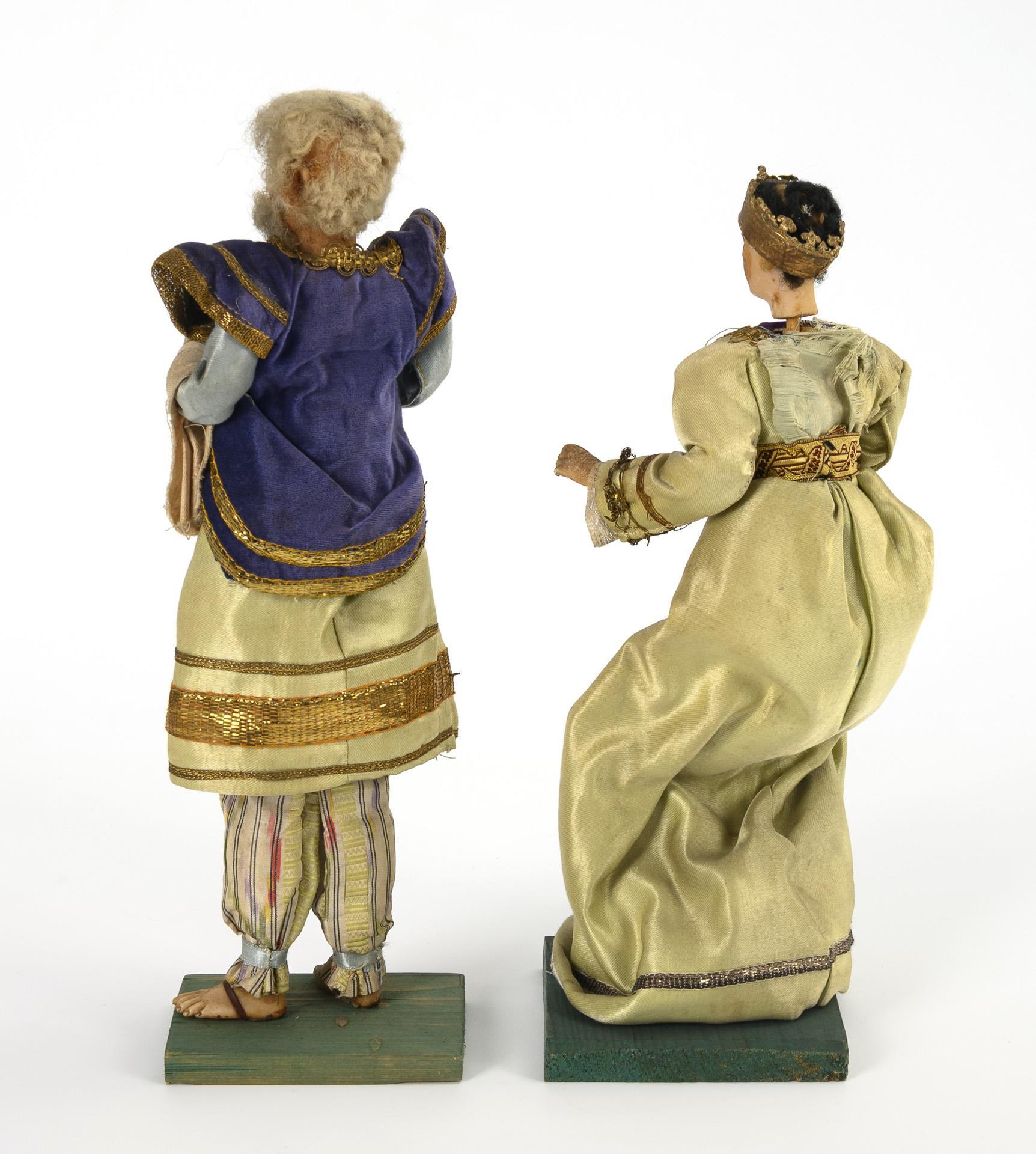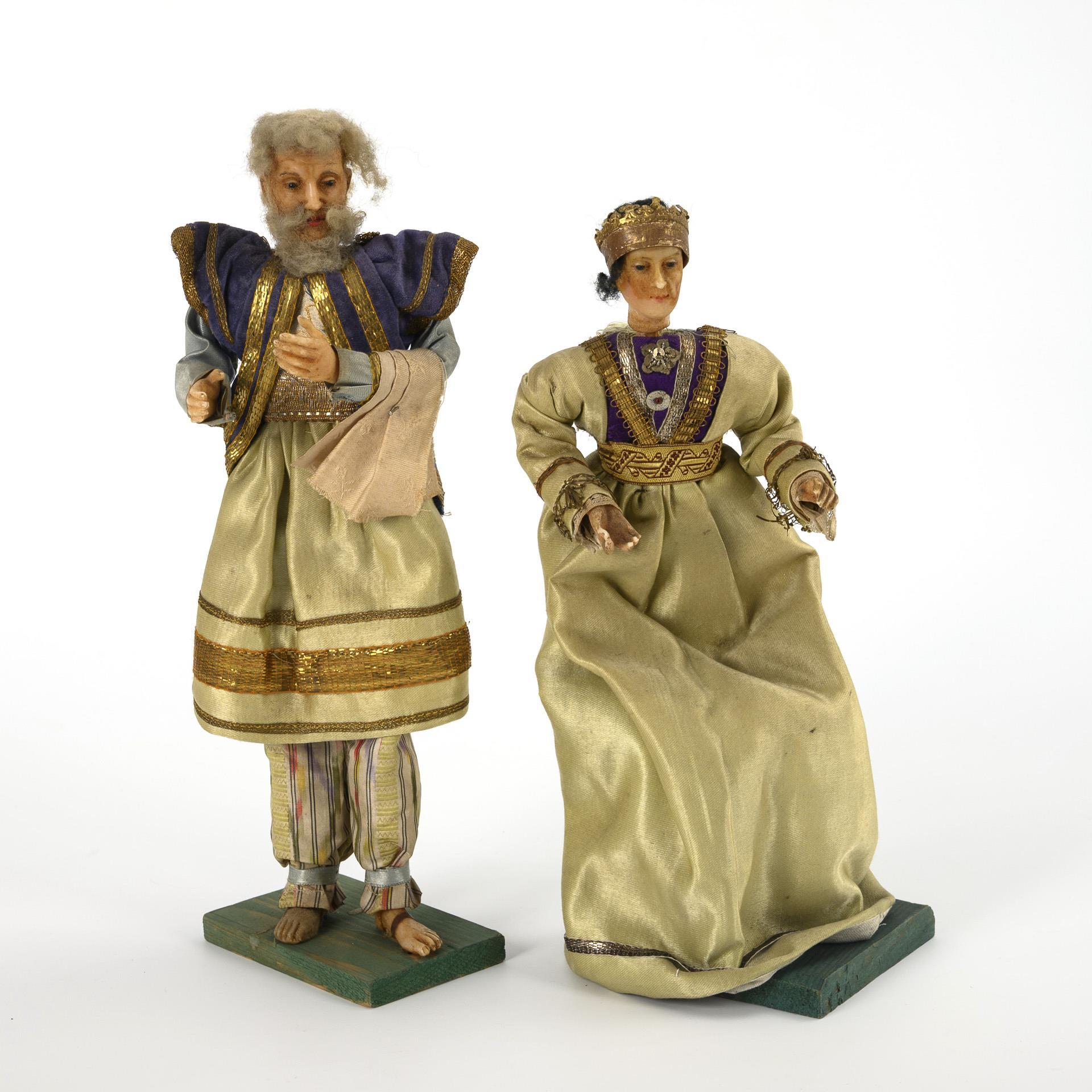 Magnificently dressed couple (Mary and Joseph?). 1 foot broken, a few signs of age/use.