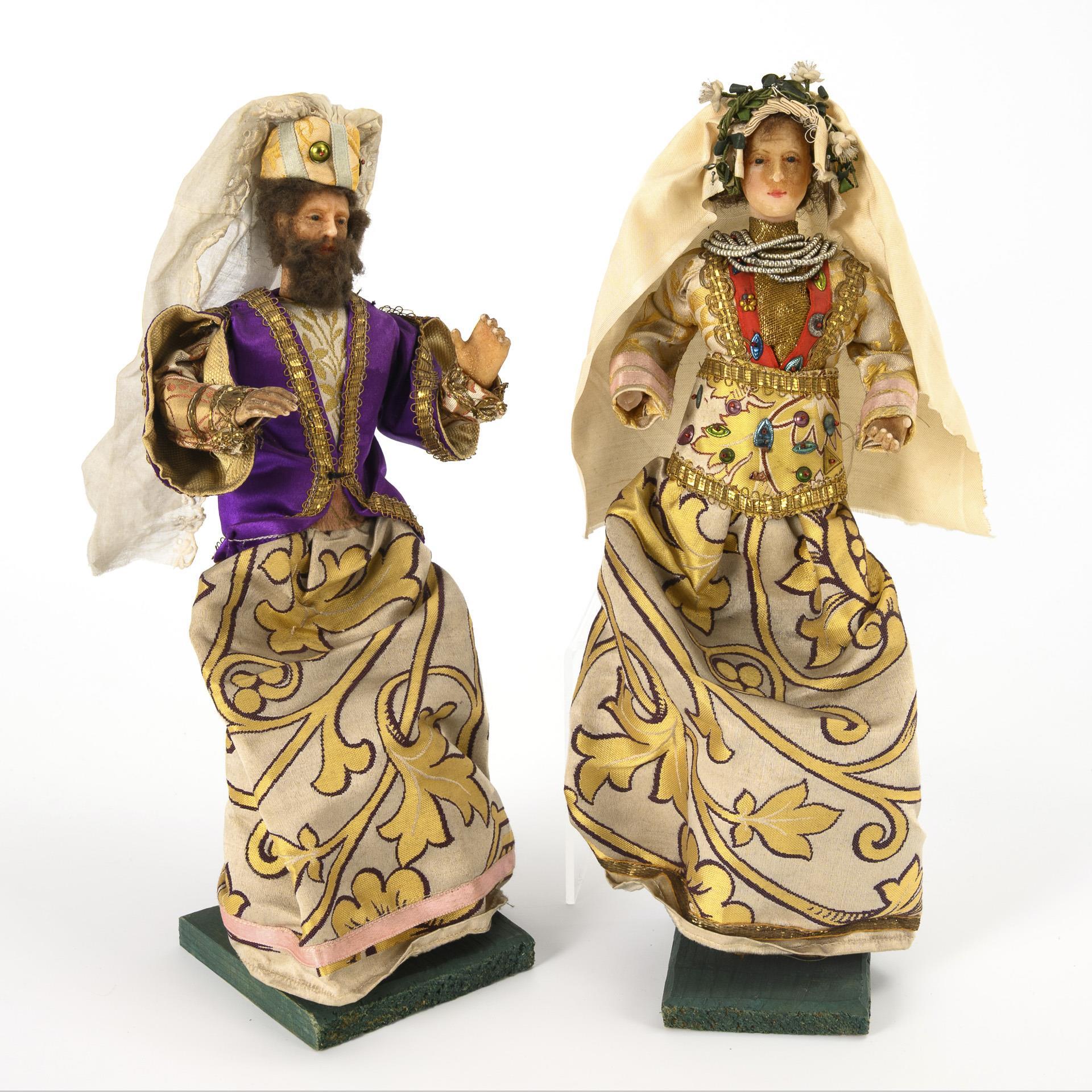 Magnificently dressed couple. 1 hand missing, each with a few traces of age/use.