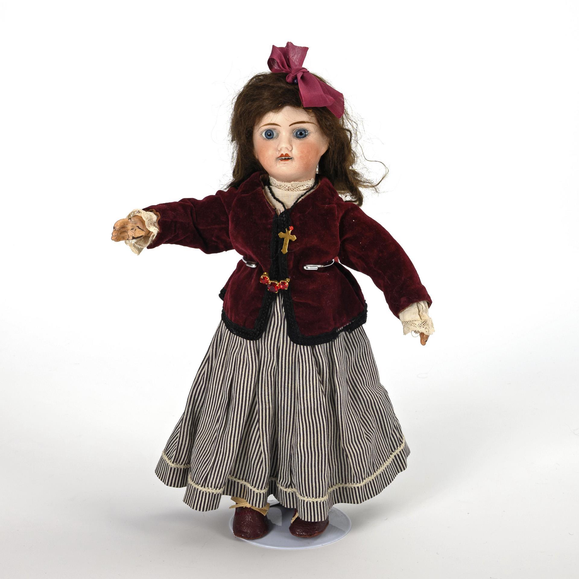 Cranked head, fixed blue glass eyes, brown mohair wig. 11-part jointed body. Striped skirt, burgundy velvet jacket, burgundy shoes. Neck crank with 1 chip, body with color defects, left middle finger missing.
