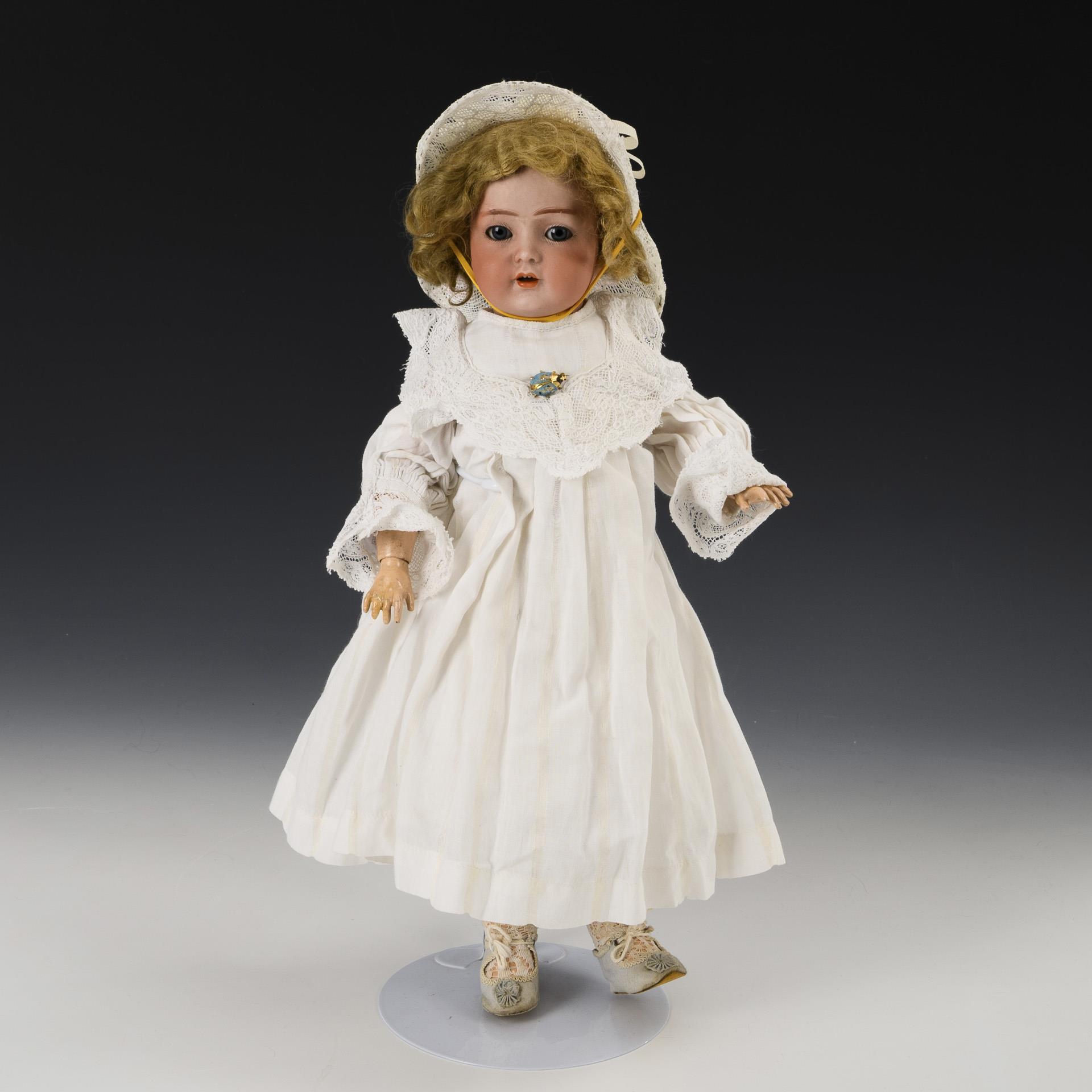 Restored crank head, blue sleeping eyes, blond mohair wig. 15-part jointed body. White dress, hat with floral decoration, light blue fabric shoes. Large, glued breakout on the forehead, torso painted over.