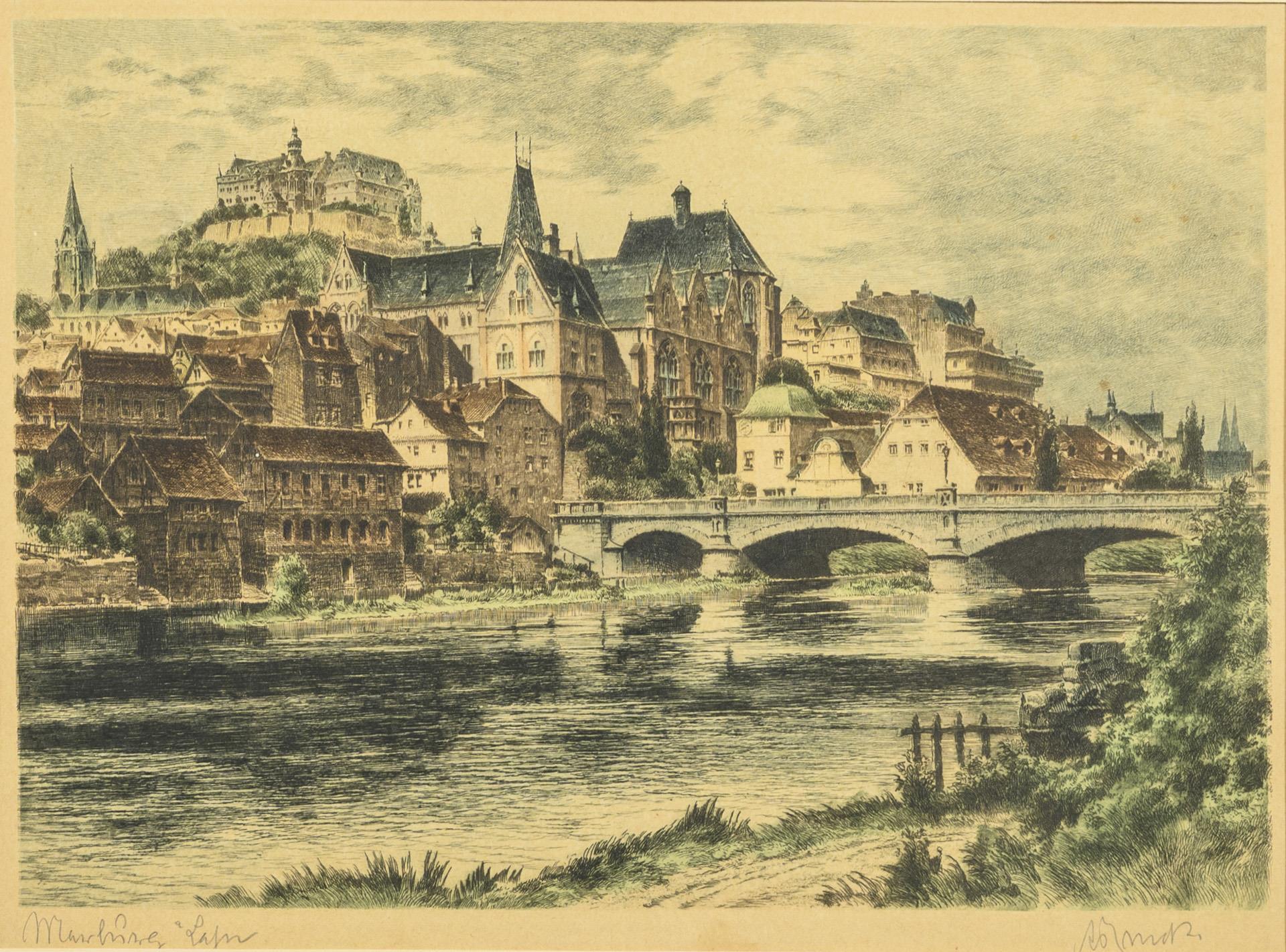 The medieval town with the castle, seen from the river. Light browning in the mat opening, not framed.