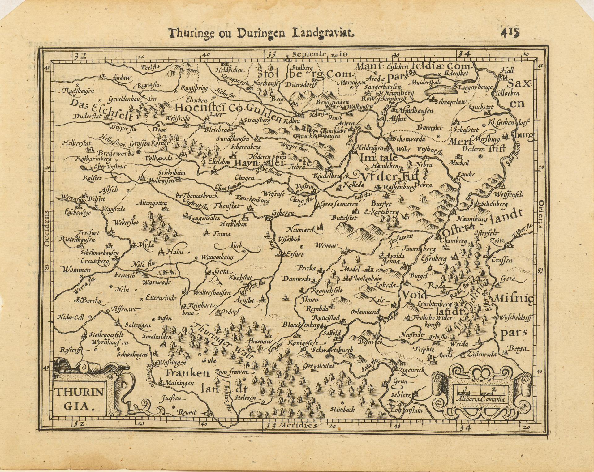 "Thuringia", small map, with Latin typography on the reverse. Probably published by Hondius.