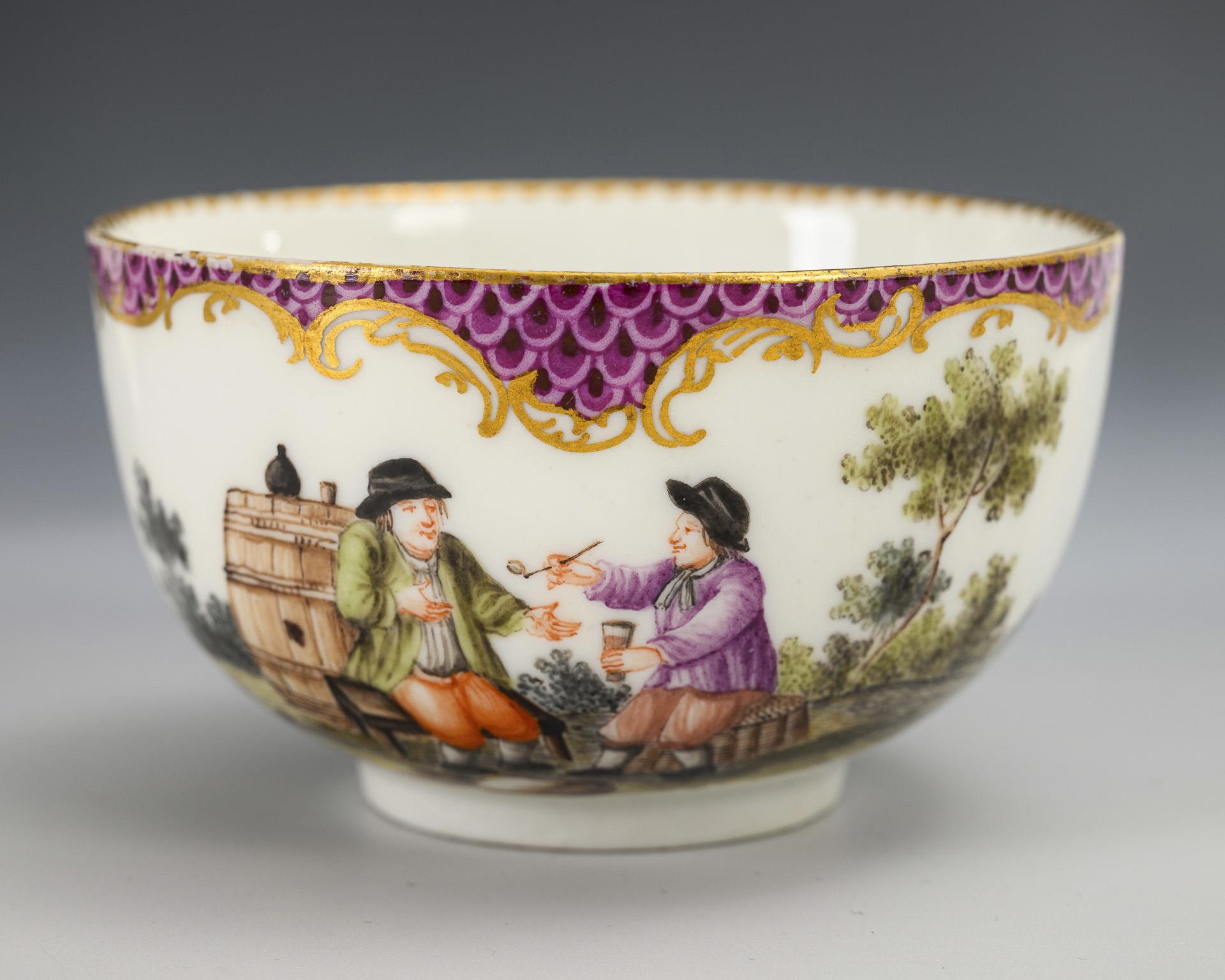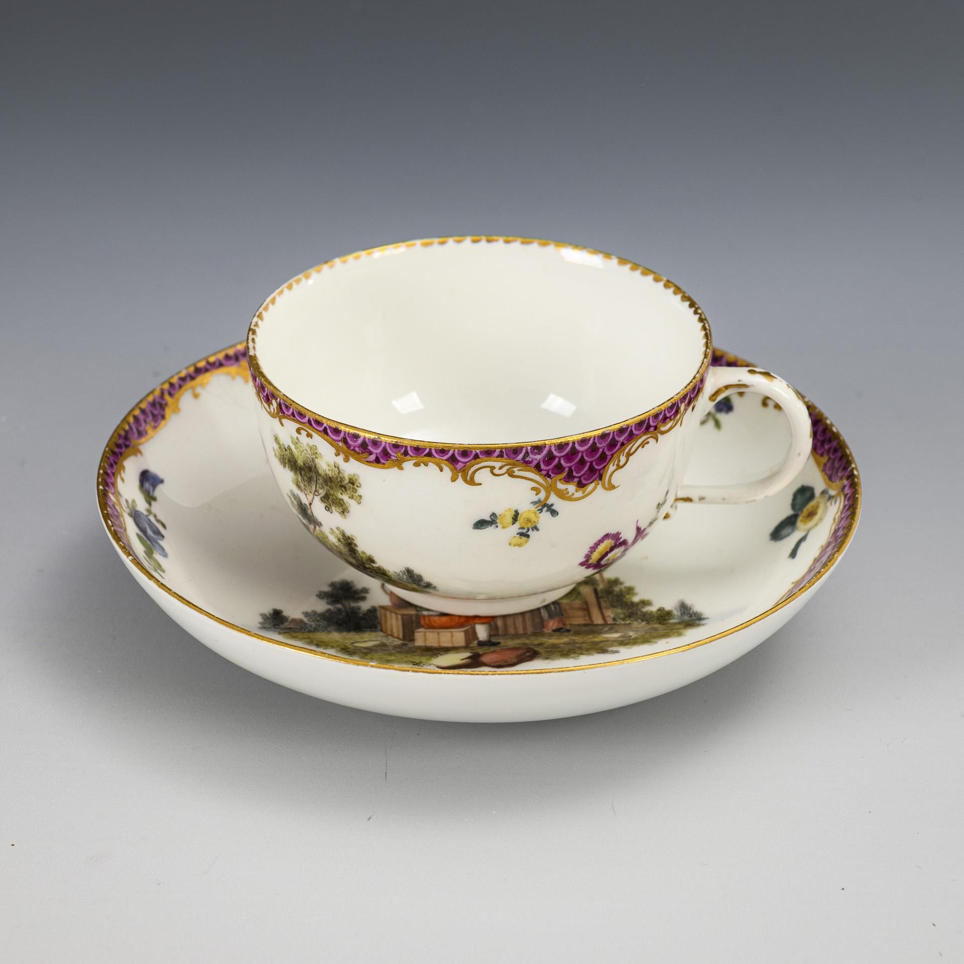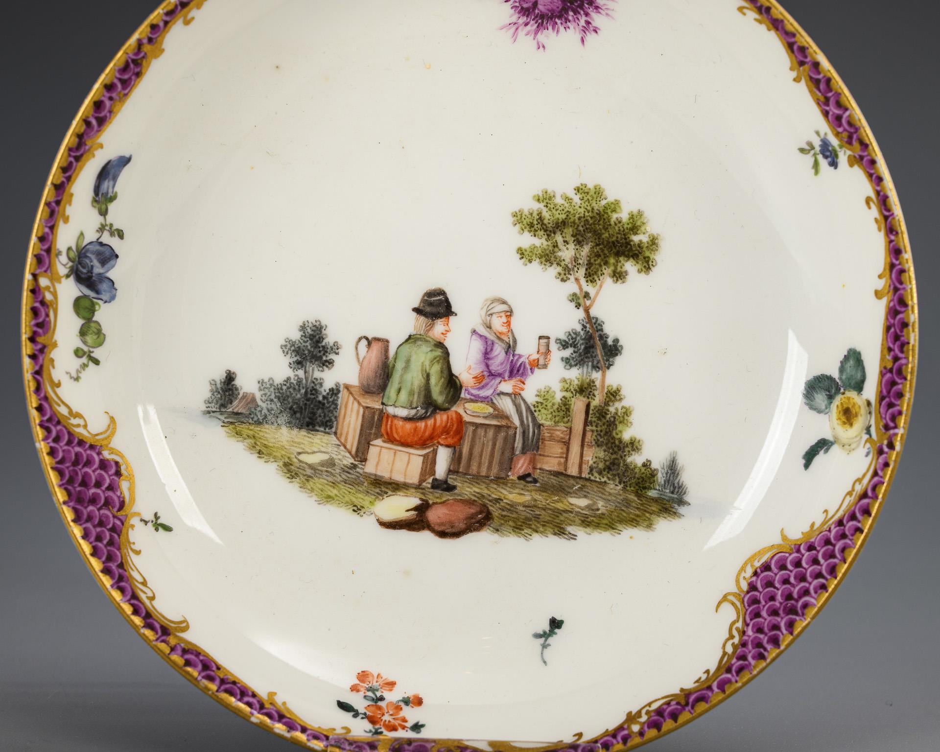 Bellied cup with ear handle. Purple scale border, the cup depicting two peasants sitting in front of a wine barrel with wine glass and pipe, in the mirror of the saucer a seated peasant couple with wine jug and glass.