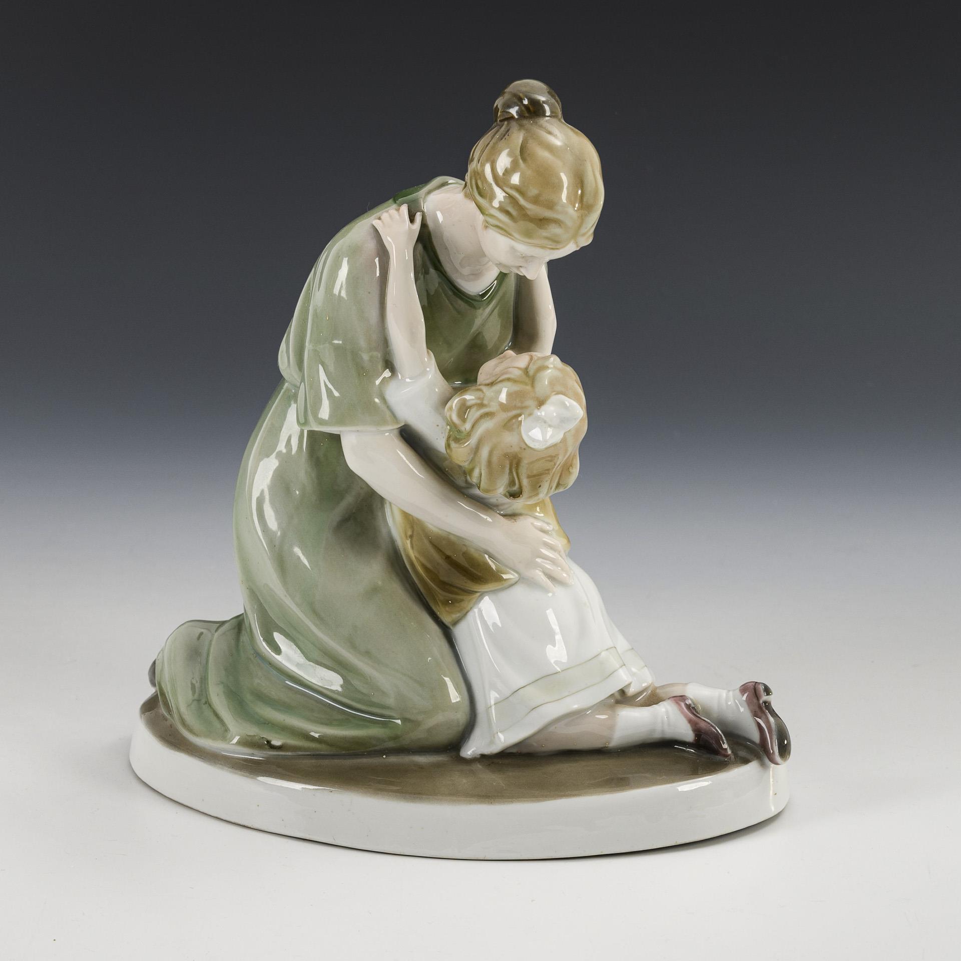 Kneeling mother, embracing her daughter. Chip on the edge of the base.