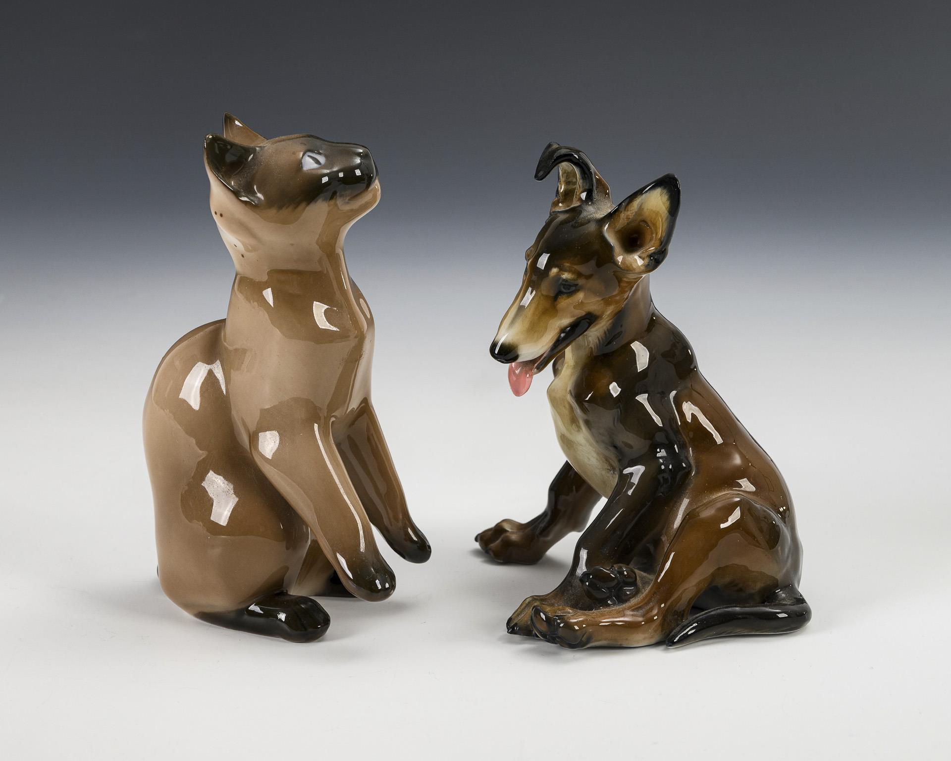 1x ROSENTHAL, 1 cut, model no. 1533, design 1934 by Theodor Kärner (1884-1966): sitting shepherd puppy / 1x BING & GRÖNDAHL, model no. 2308, design by Svend Jespersen (1895-1985): seated Siamese cat.