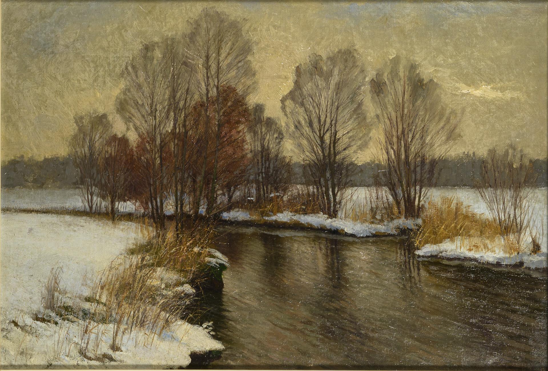 River bend between white plains with a small group of trees under an overcast sky. Slight traces of age.