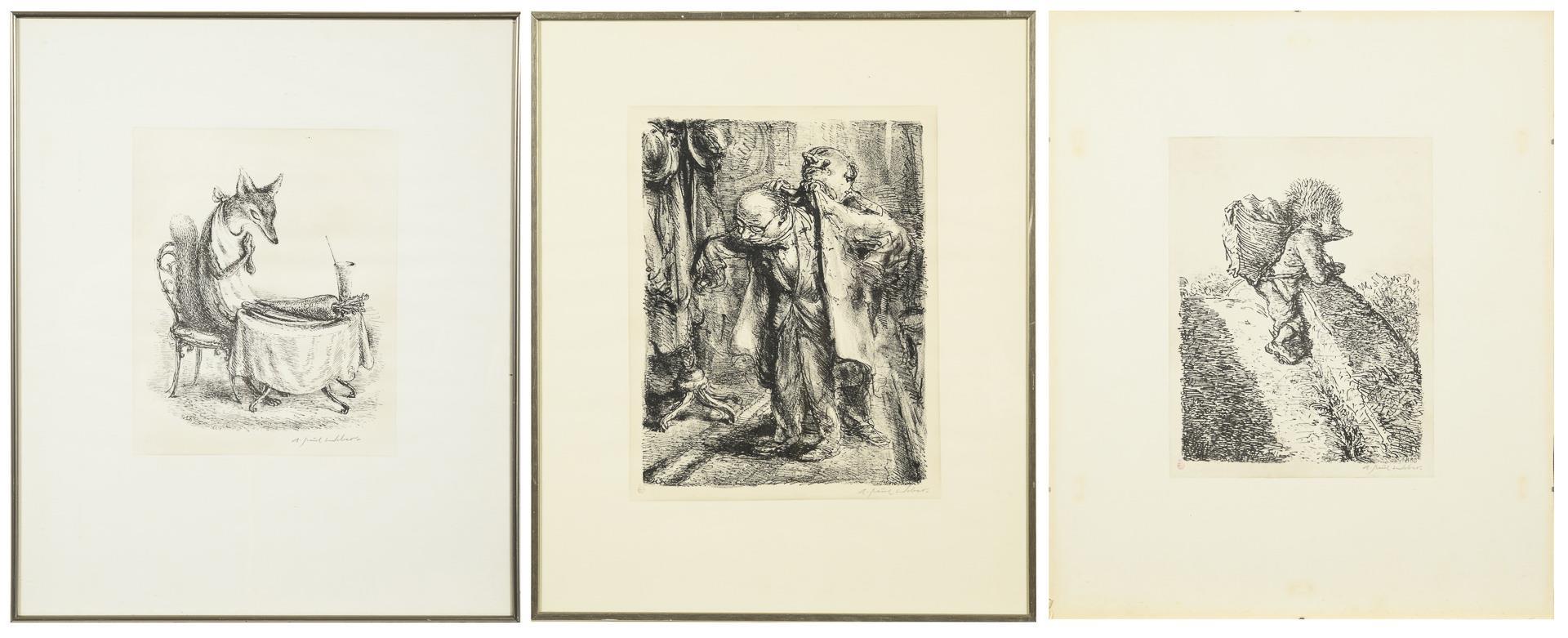 "Auf der Brücke, Igelhausen", no. 1880, approx. 28 x 24 cm / Fox, sitting at a table, in front of a large carrot. No. 16678, approx. 27 x 25 cm / A man being helped into his coat. No. 15970, 36 x 28 cm. Bird sheet slightly stained in the margin.