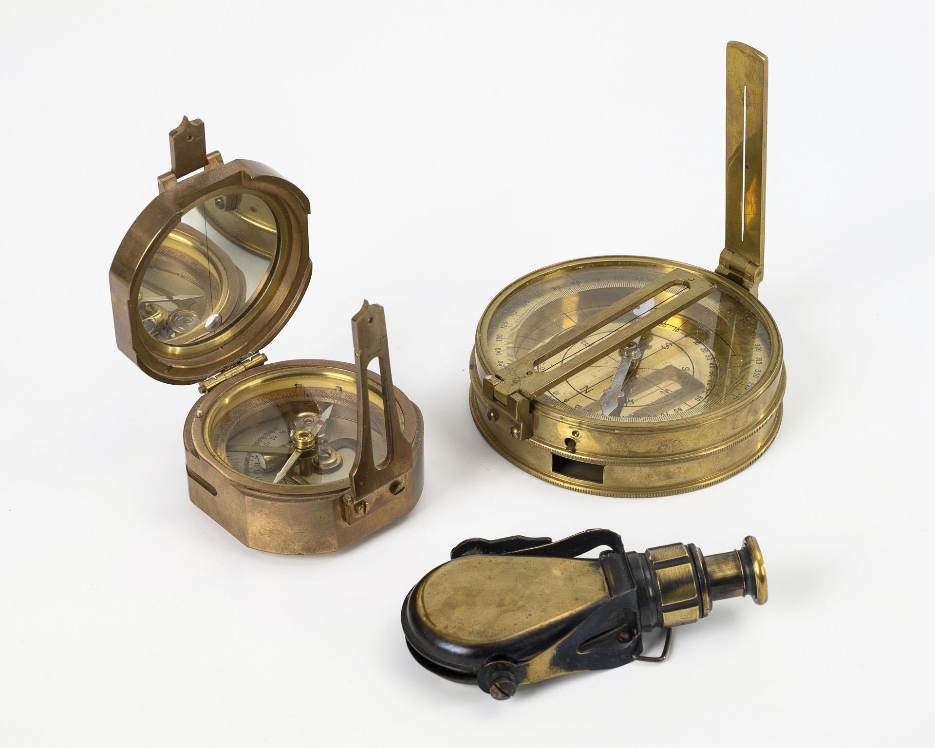 Probably British bearing compass with fold-out bearing rod and mirror in the hinged lid. Under the glass compass with automatic needle lock, 2 vials and rotating vernier over 2 quadrants. / Large bearing compass (geological compass) on the lid marked "Stanley & Co. London" marked with no. "1754". Thread for a tripod on the base, 2 scales: 360° and 4 quadrants at 90°, sighting device consisting of two hinged visors (lid stiff, needle lock defective). / Pocket compass with hinged lens between the protective covers and strap eyelet.