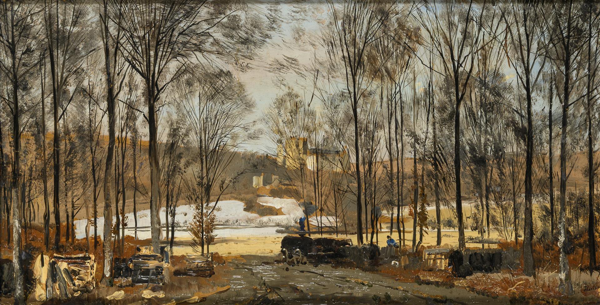 Snow melting between the bare forests on a sunny day in early spring.
