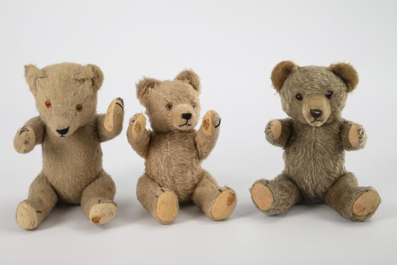 All with swivel head and disk joints. Large brown teddy bear with open mouth, brown tipped fur and velvet paws (L 52 cm), 3 small blond teddies with felt paws, 2x with intact voice (L 27 - 34 cm). Worn, 2x with defects.