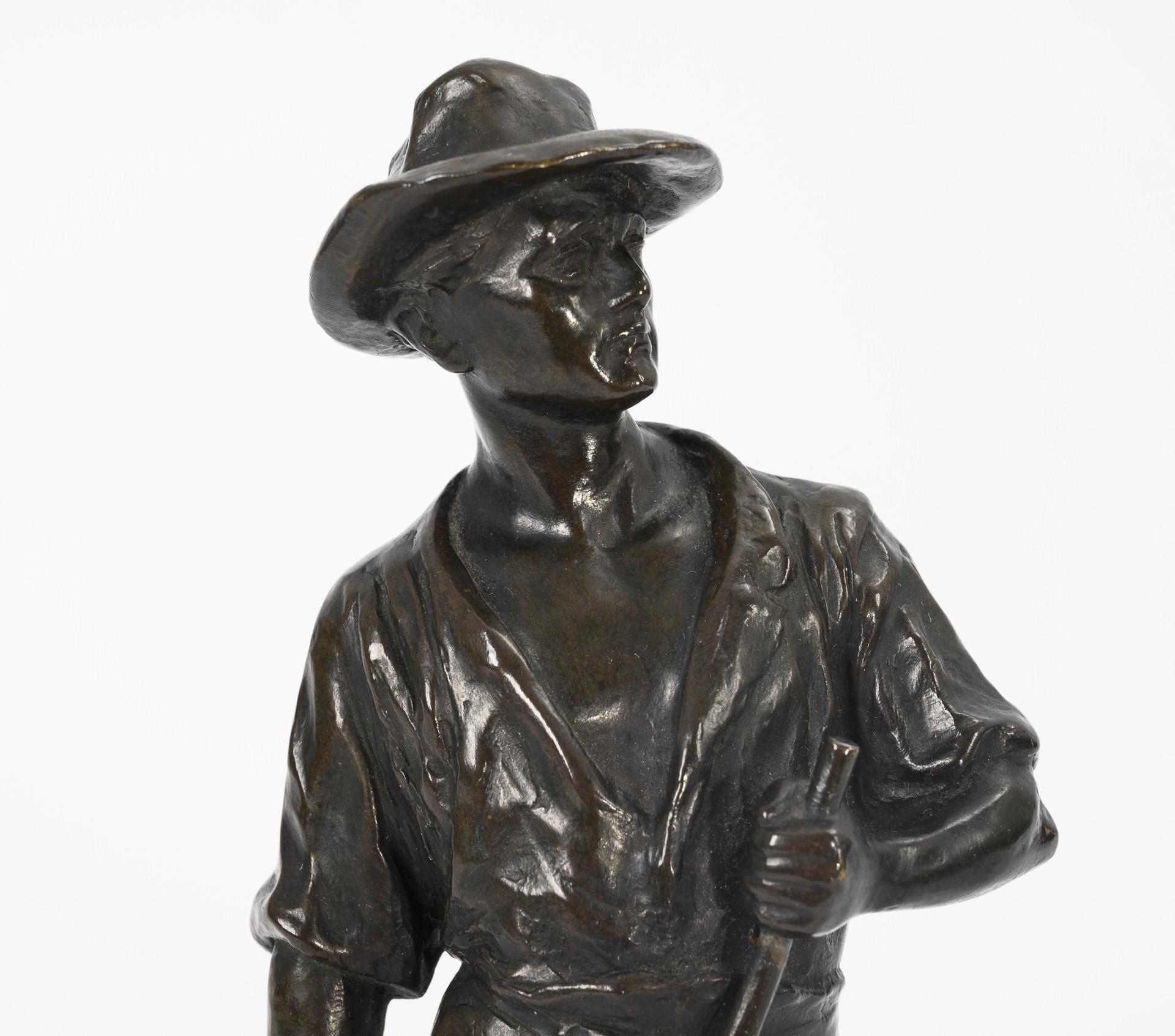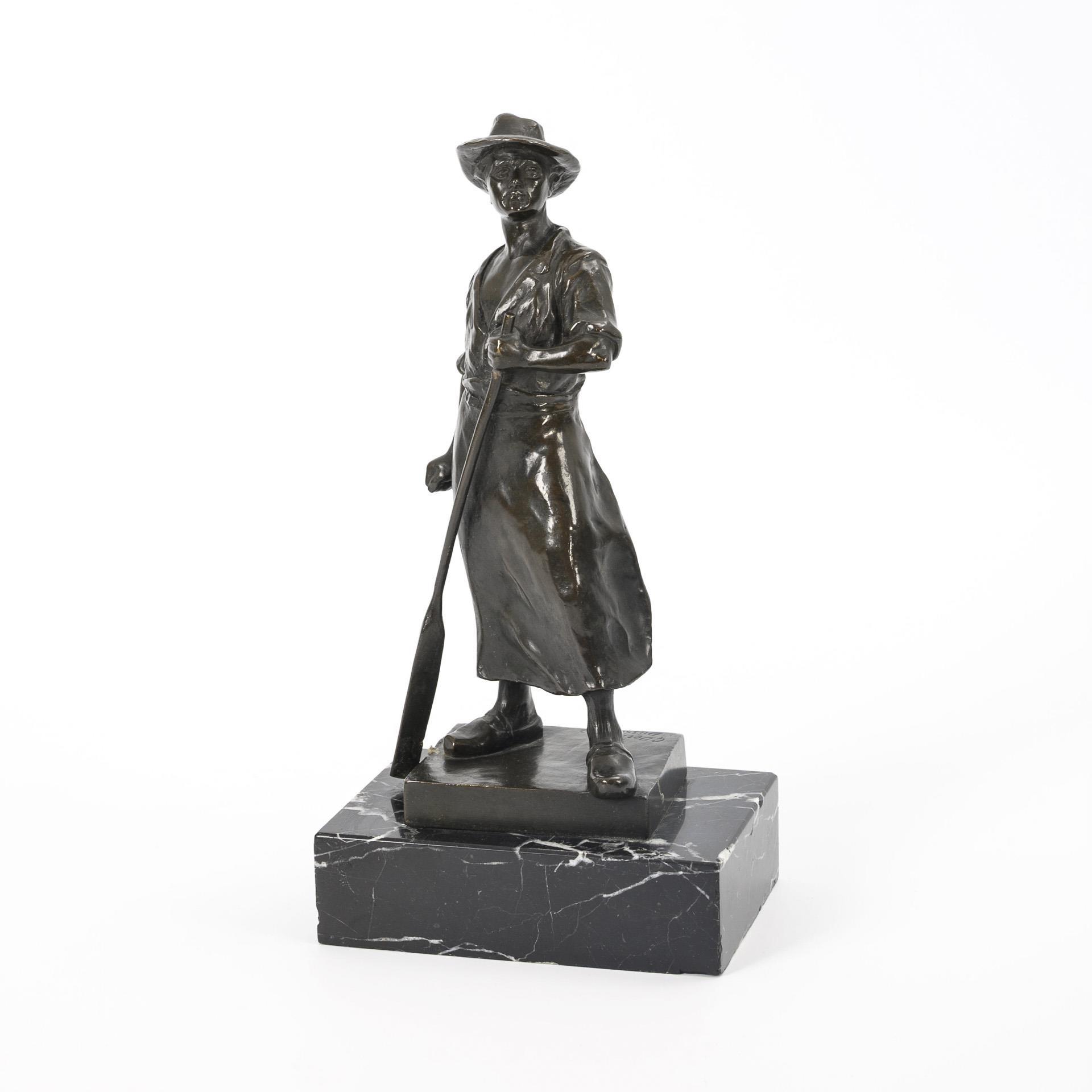 Determined looking, strong worker with apron and hat and long trowel in his hand. Trowel slightly bent, minor chips to the marble.