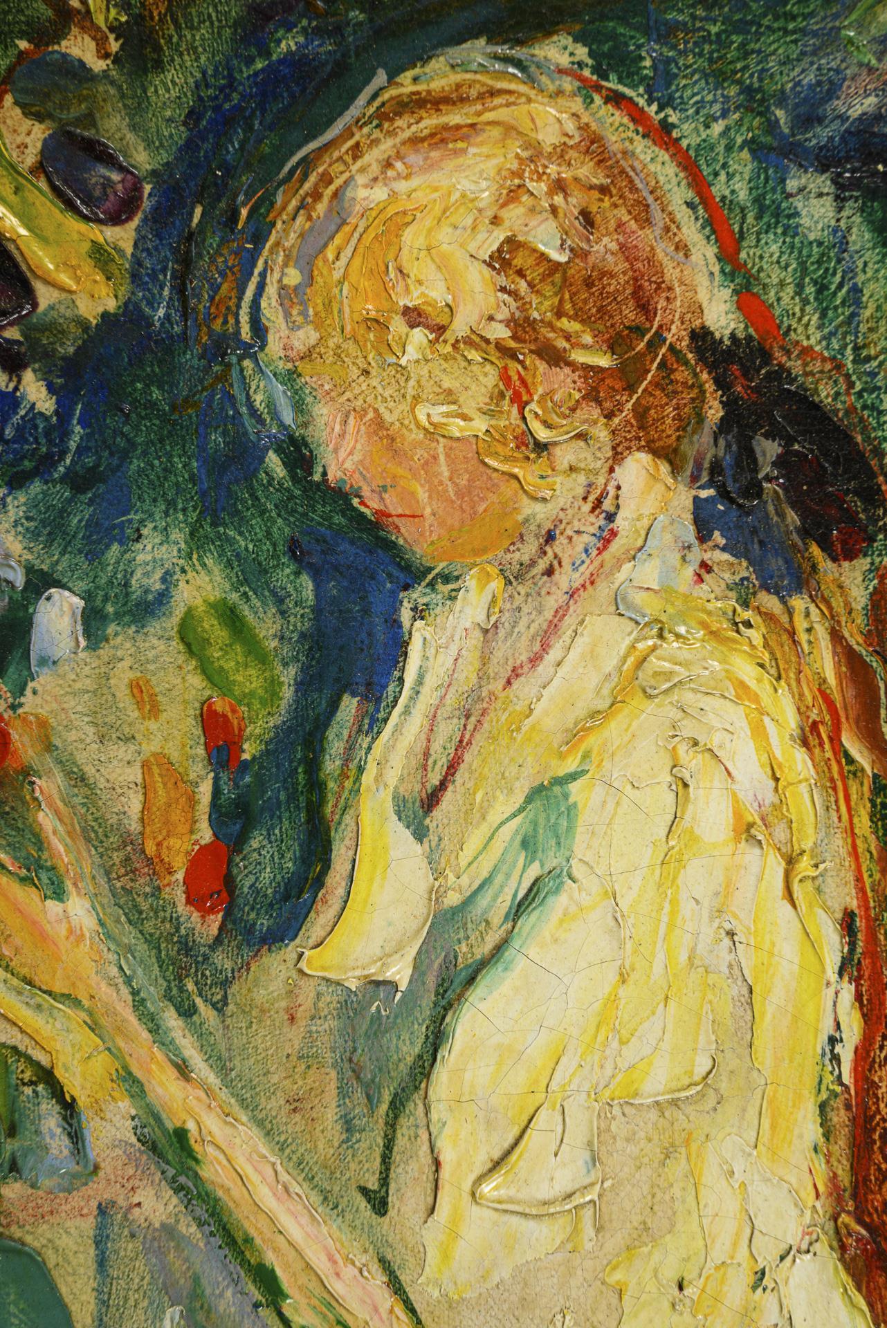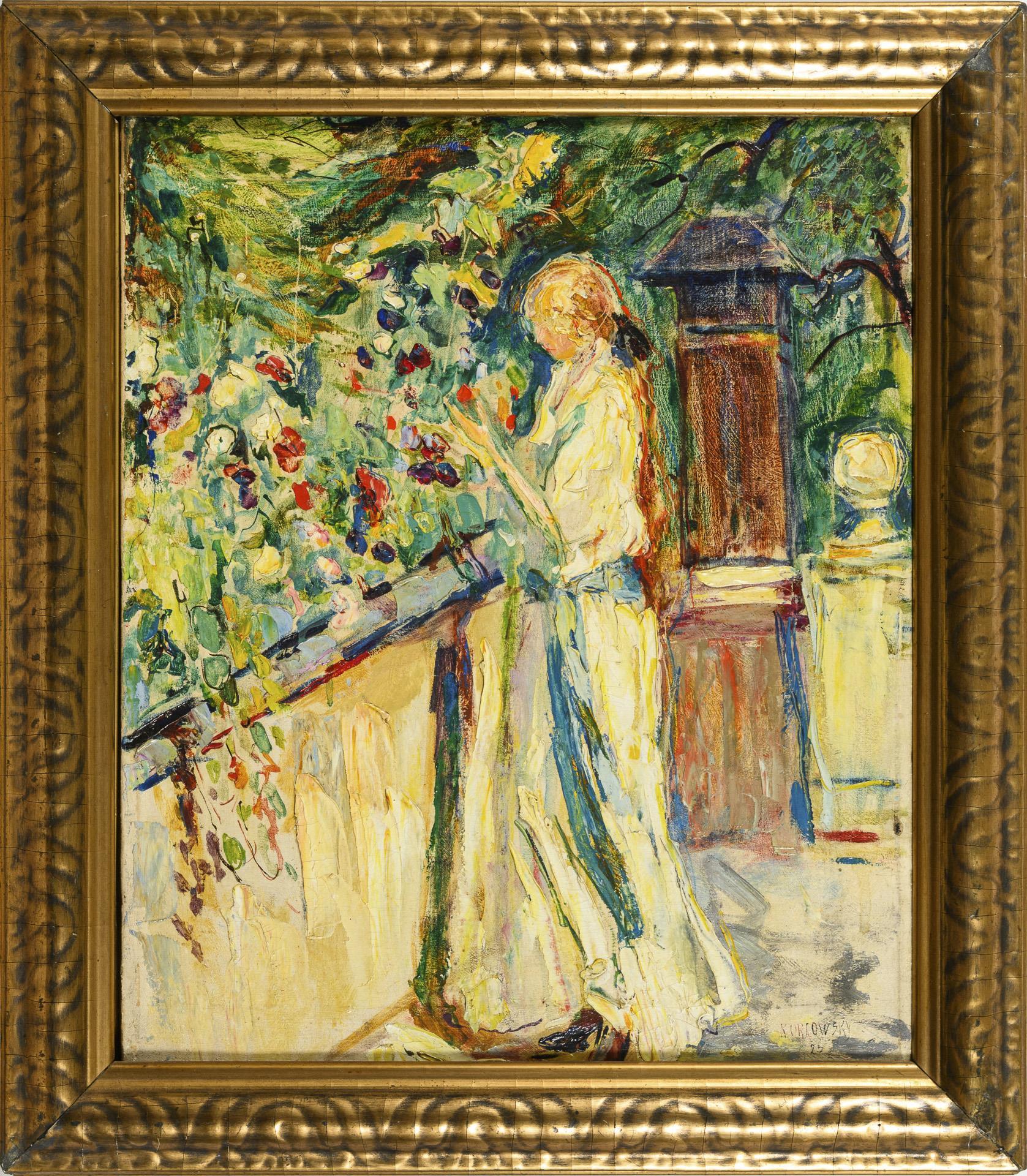 Pastos and expressively painted garden scene with a woman looking at the flowers in the sunshine. Minimal traces of age.