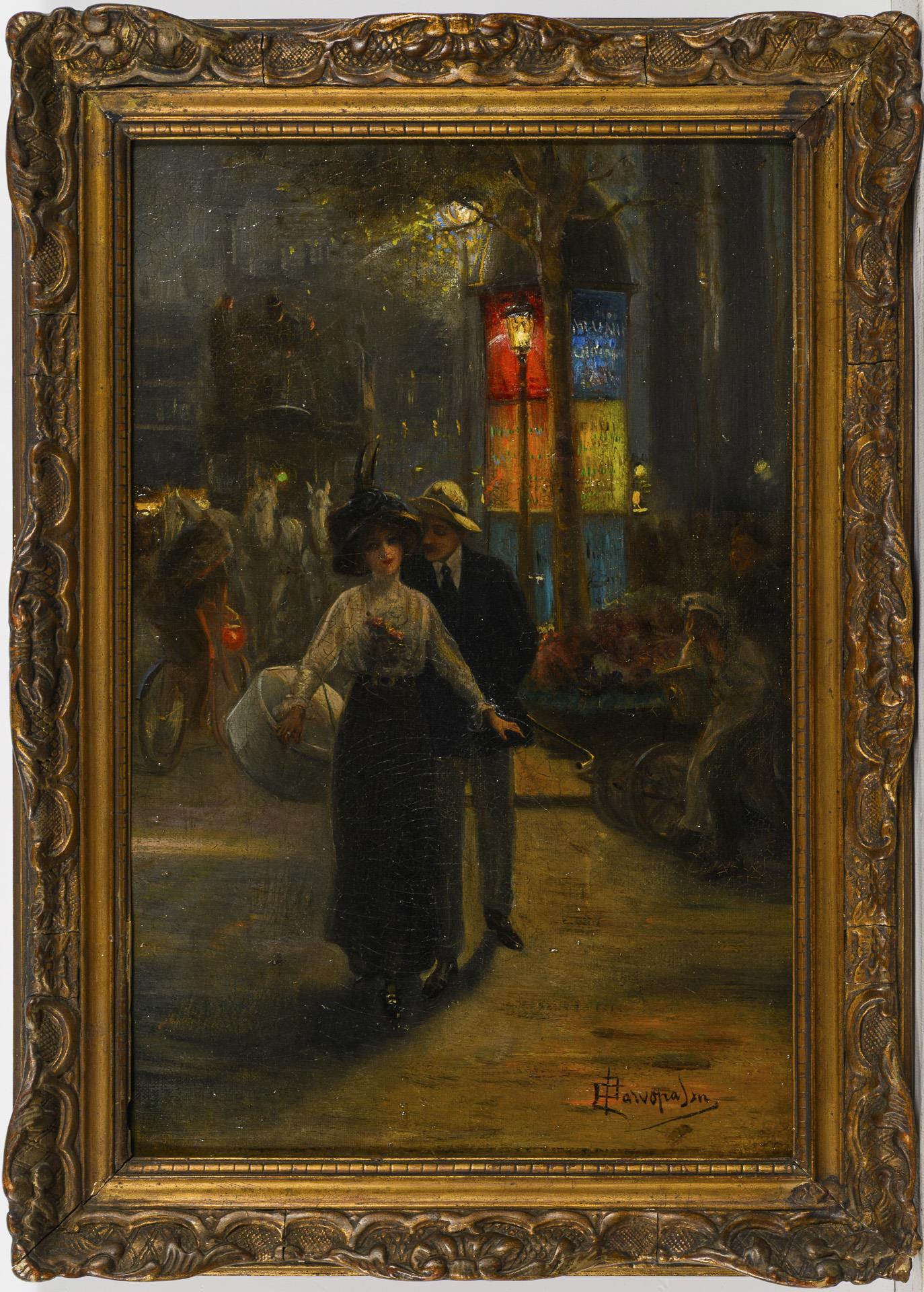 Young couple at night on a busy street in the light of a lantern. Slightly soiled varnish.